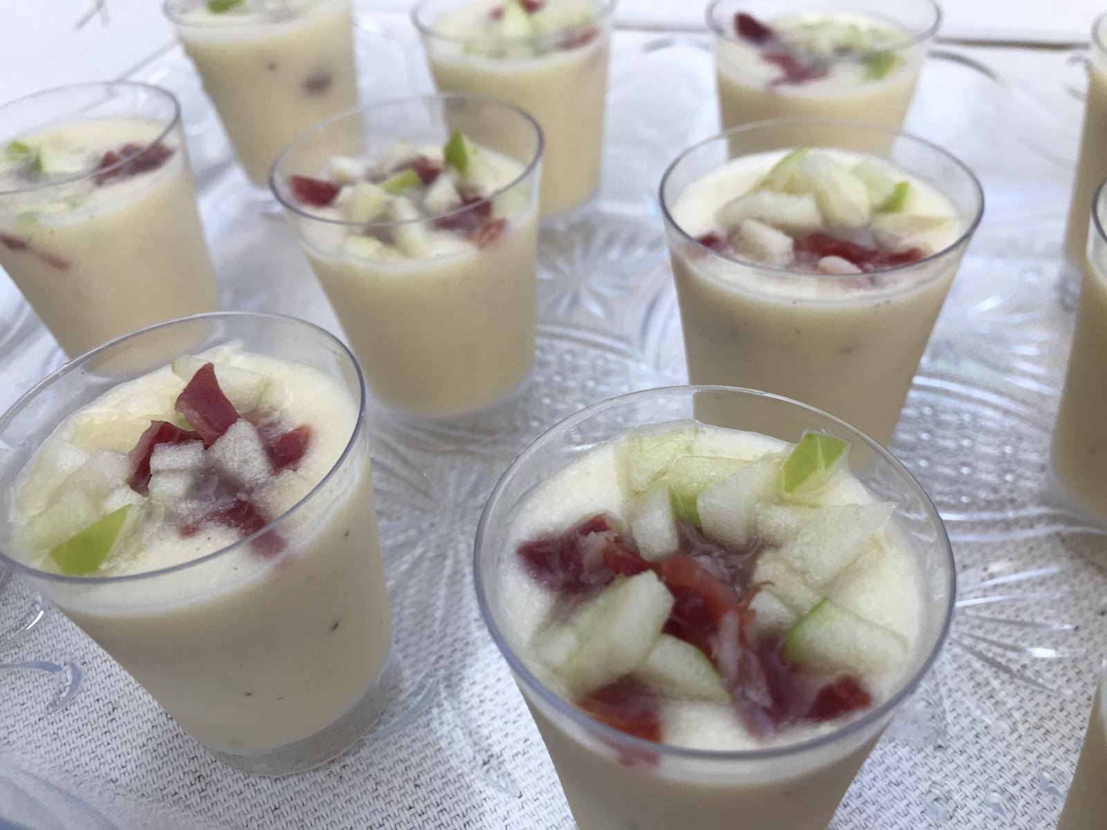 Servir bien frío en vasitos de chupito y con unas lascas de manzana y jamón en cada vasito.