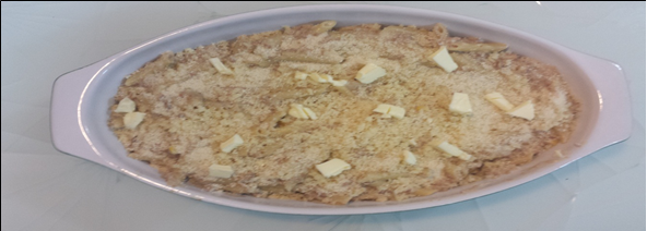 Vierta en una fuente de horno y espolvoree con el queso rallado, el pan rallado y unos trocitos de mantequilla. (en ese punto se puede congelar si no se va ha comer en dos días)