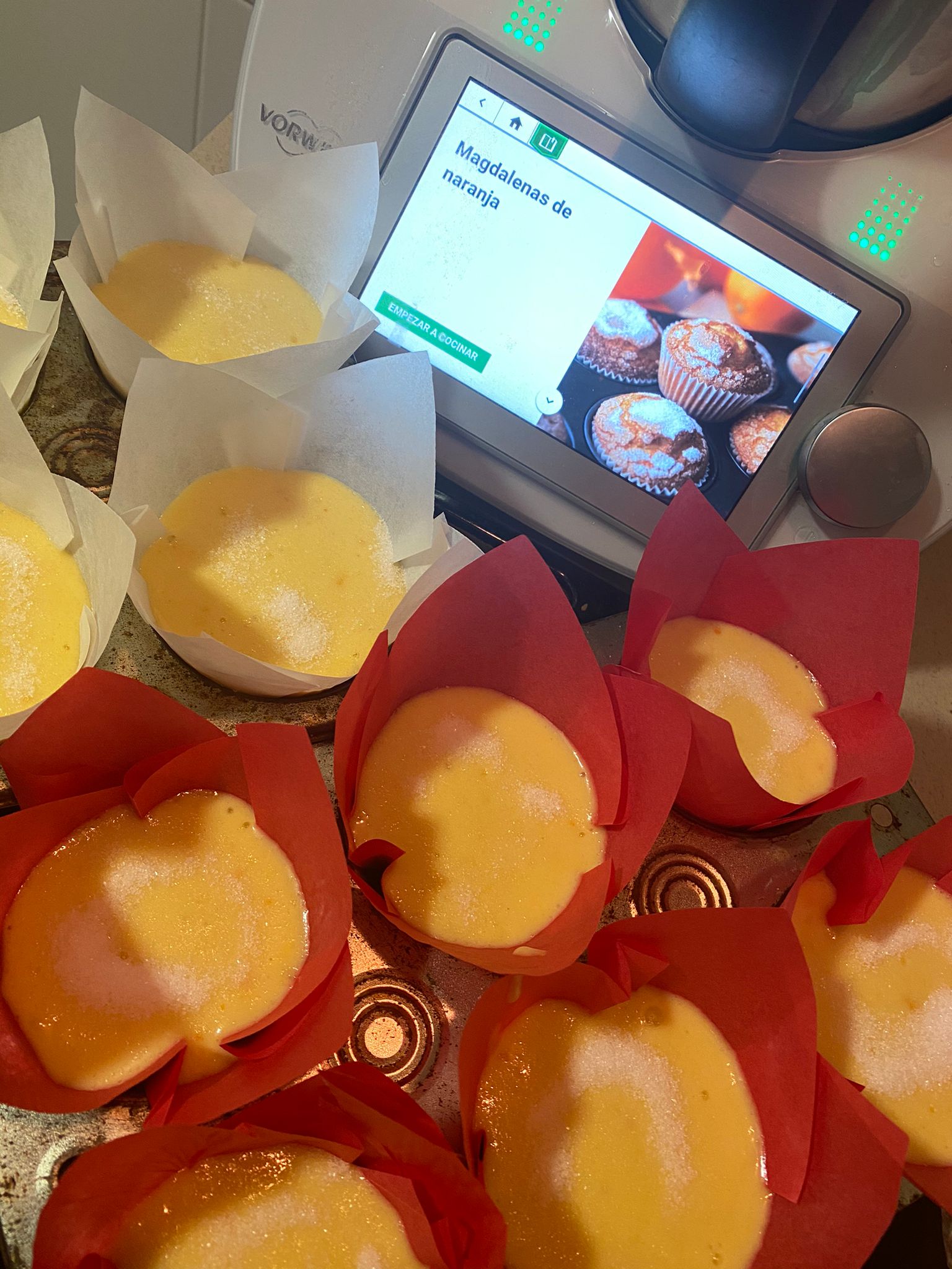 Tenemos naranjas en casa así que hemos buscado recetas en cookidoo y hemos decidido hacer magdalenas de naranja, asó aprovechamos nuestro ingrediente y además podemos aprovecharlas para merendar con un vaso de leche o un zumo preparado con nuestro thermomix.