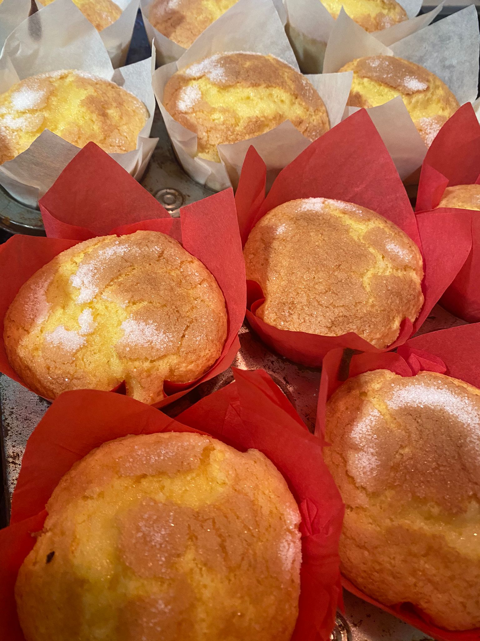 Las hemos hecho con unos moldes más altos, de papel, de esta forma se nos han quedado más altas, como si fuesen cupcakes, y a su vez en un molde de agujeros para magdalenas.