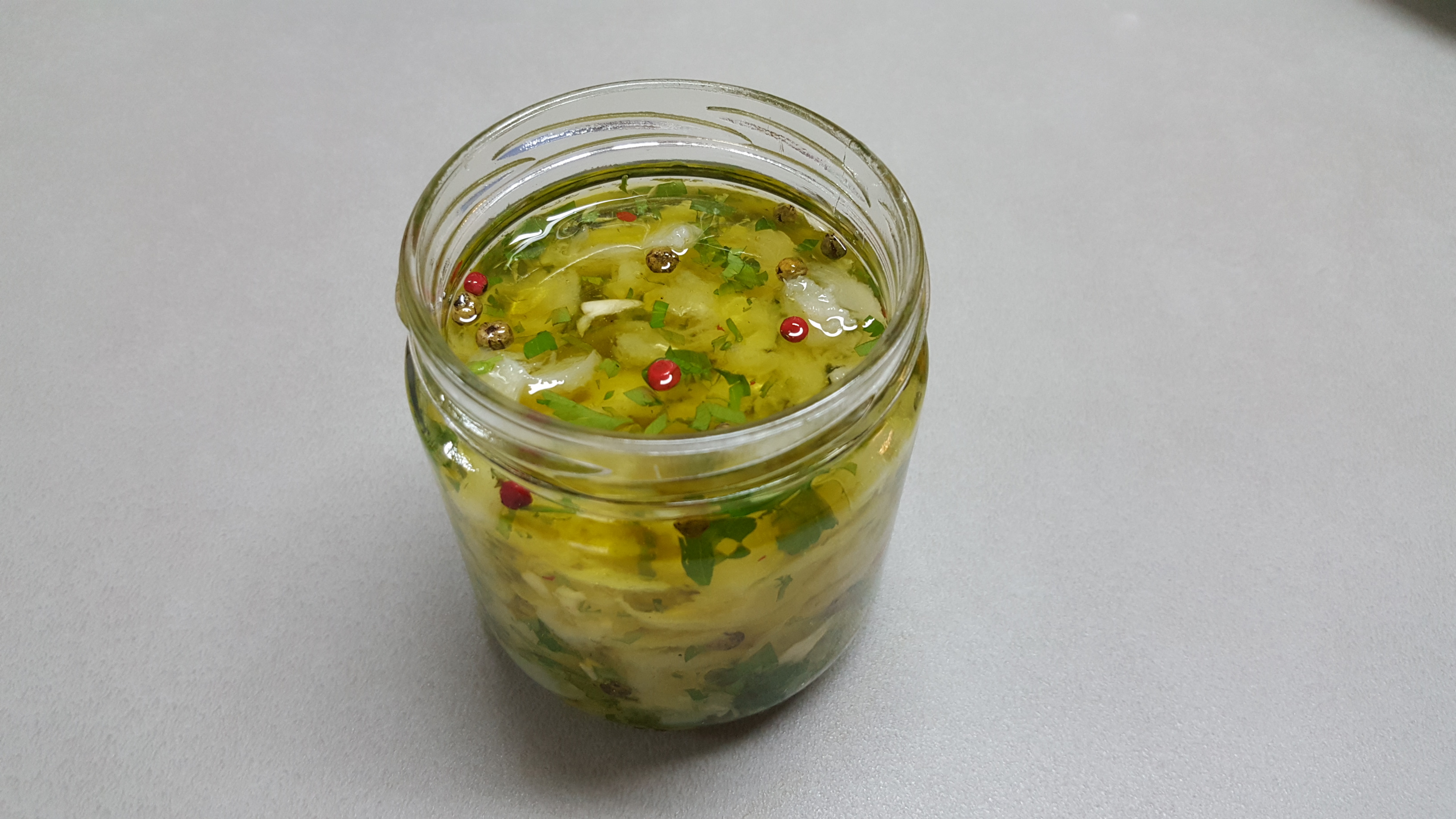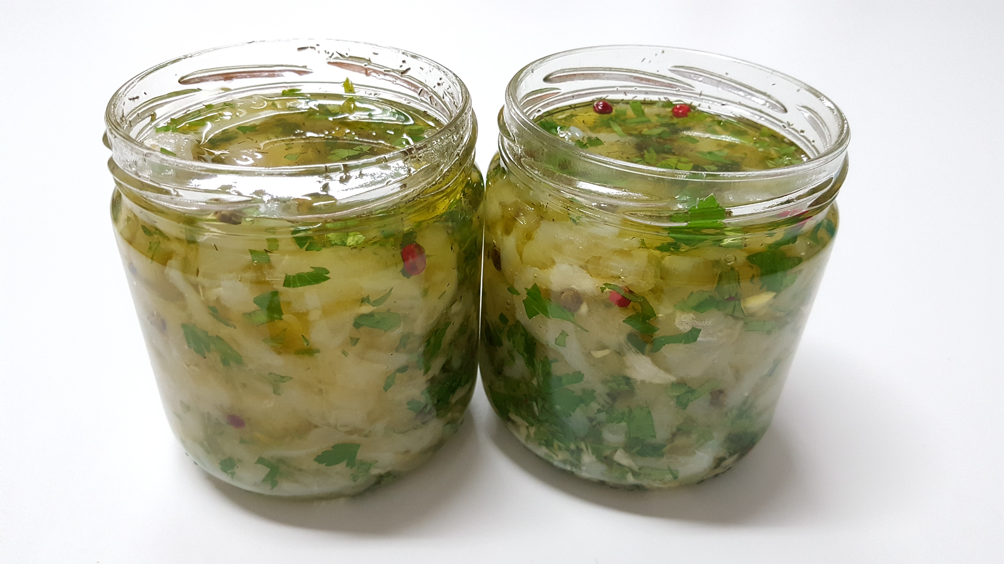 En dos tarros de cristal de 200ml o 250 ml ponemos una capa de aceite y perejil y vamos poniendo el bacalao desmenuzado, tiene que quedar completamente cubierto por el aceite. Dejar infusionar dos días, pero mientras más días más sabor tiene.