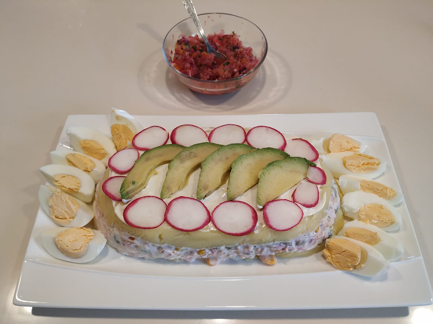 Desmolde en una fuente para servir y decore con la mayonesa y las láminas de aguacate reservadas. Sirva con la salsa de cebolla y ají.