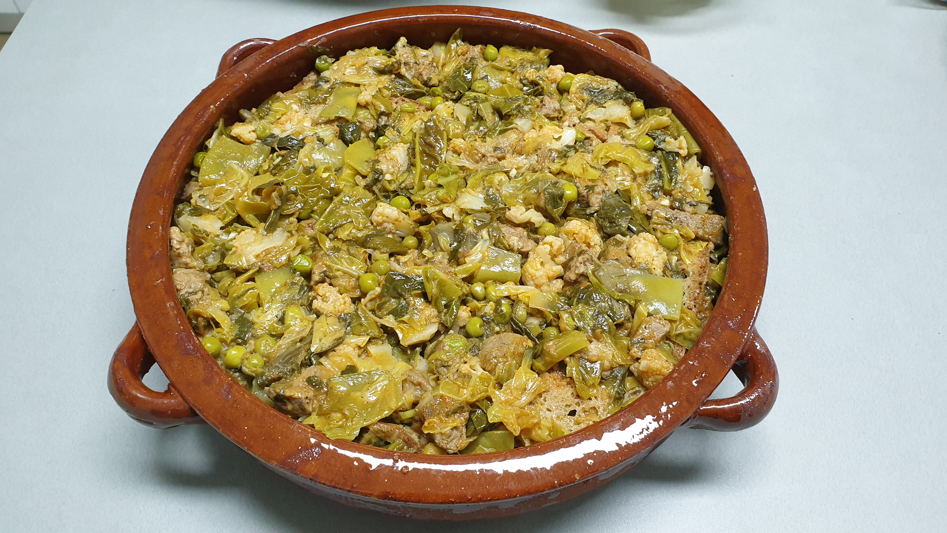 8. En una cazuela de barro típica mallorquina, se ponen capas de pan y de verduras escurridas, se va apretando y poniendo capas, se rocia la ultima capa con aceite de oliva virgen extra y a disfrutar, estan riquisimas ¡!