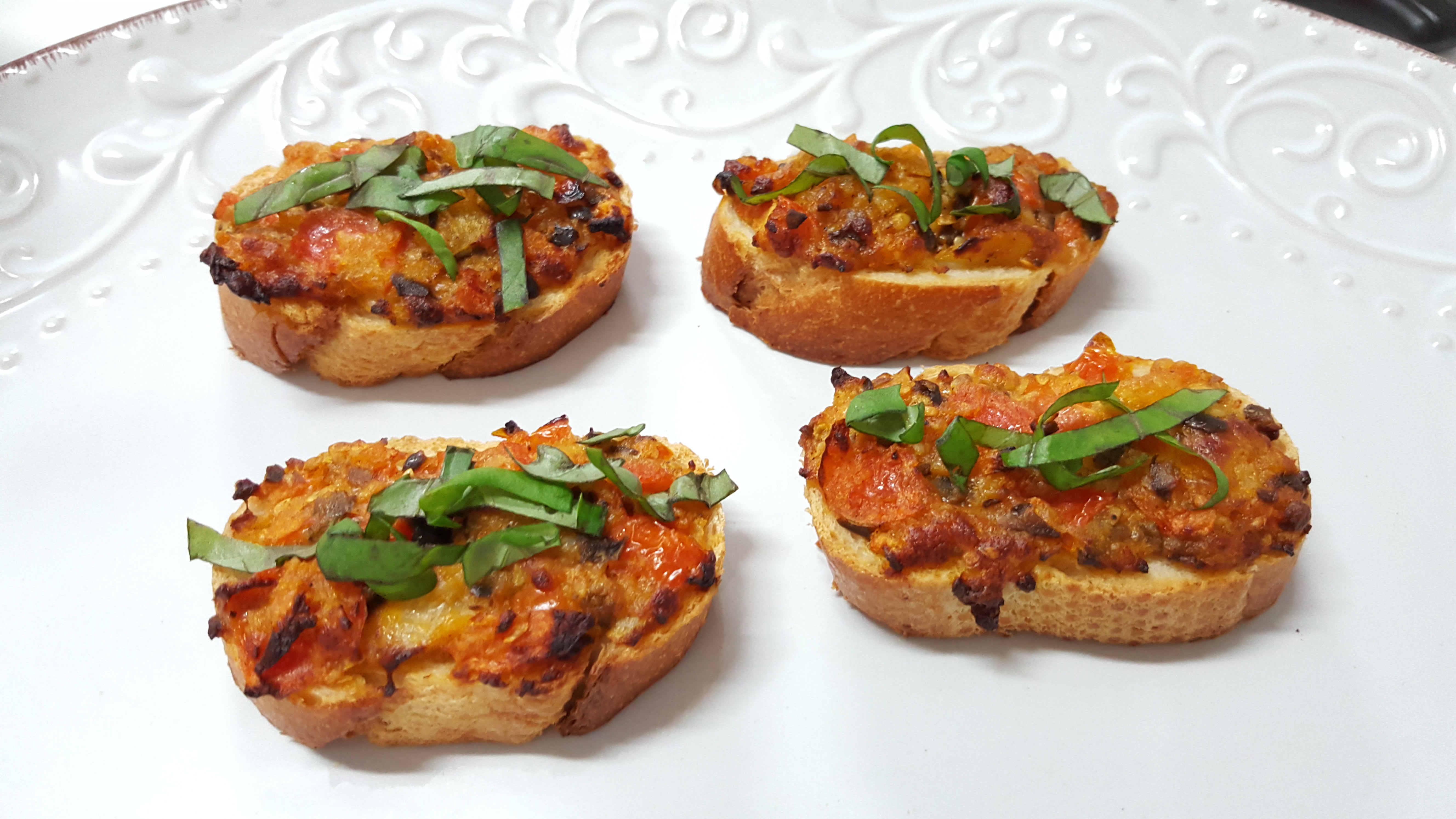 Hornee durante 15 minutos (250°C). Reparta las tiras de albahaca sobre los crostini y sirva calientes.