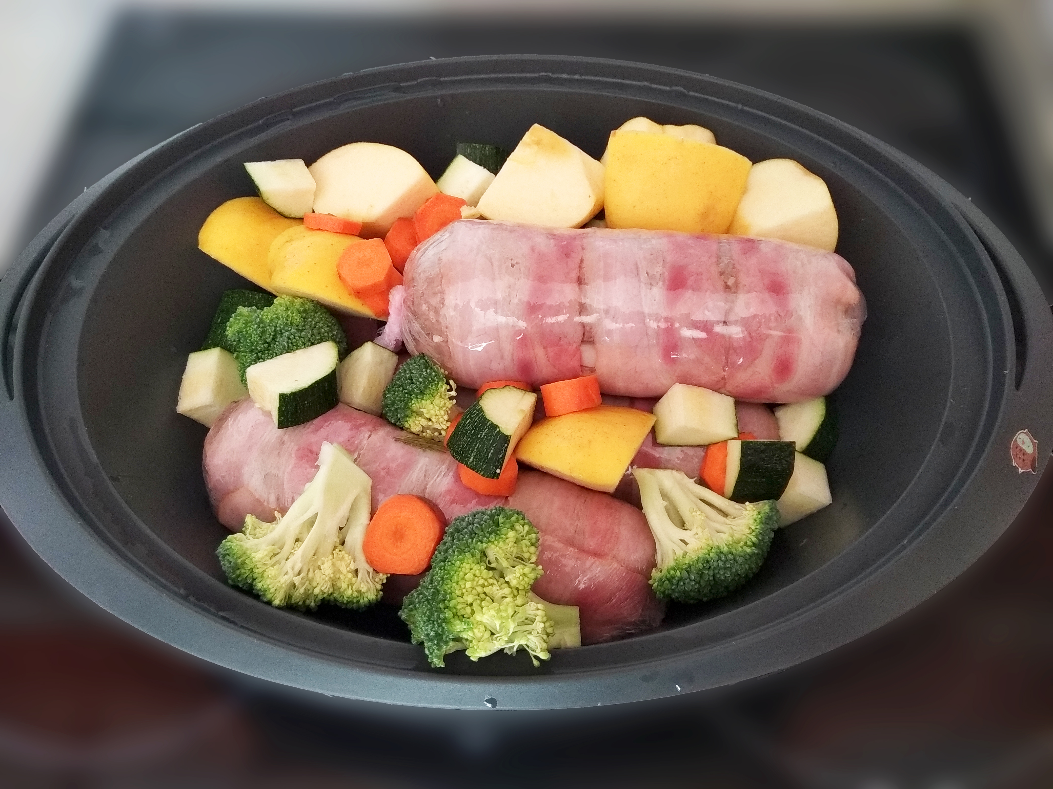 Con cuidado de no quemarse, destape el Varoma y ponga alrededor del rollo las verduras.