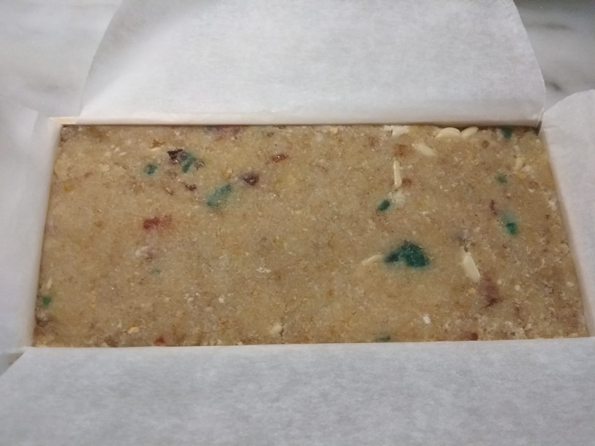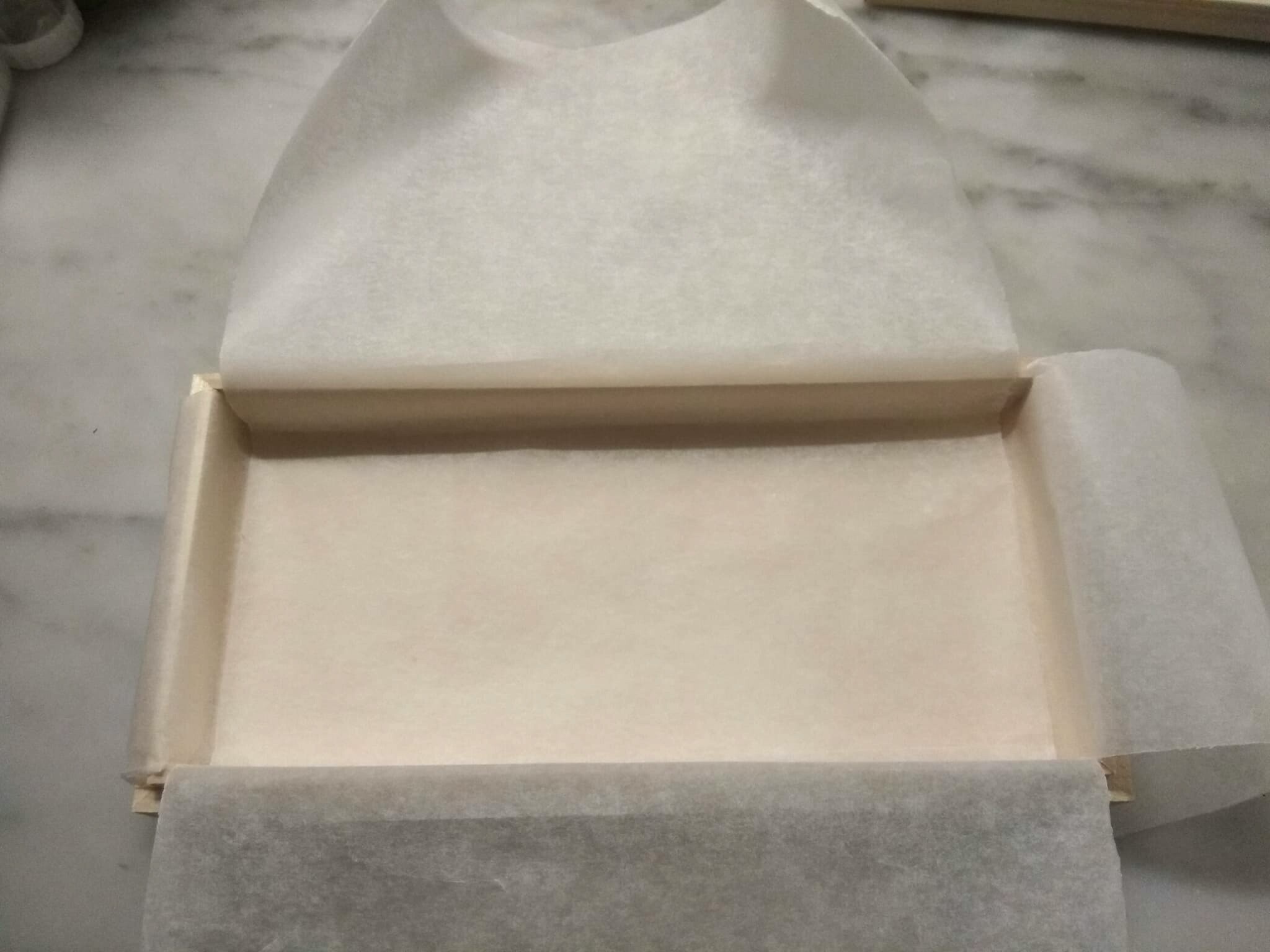 - Preparar un molde grande , o varios pequeños, forrados con pael de horno. O cajas de turrón: