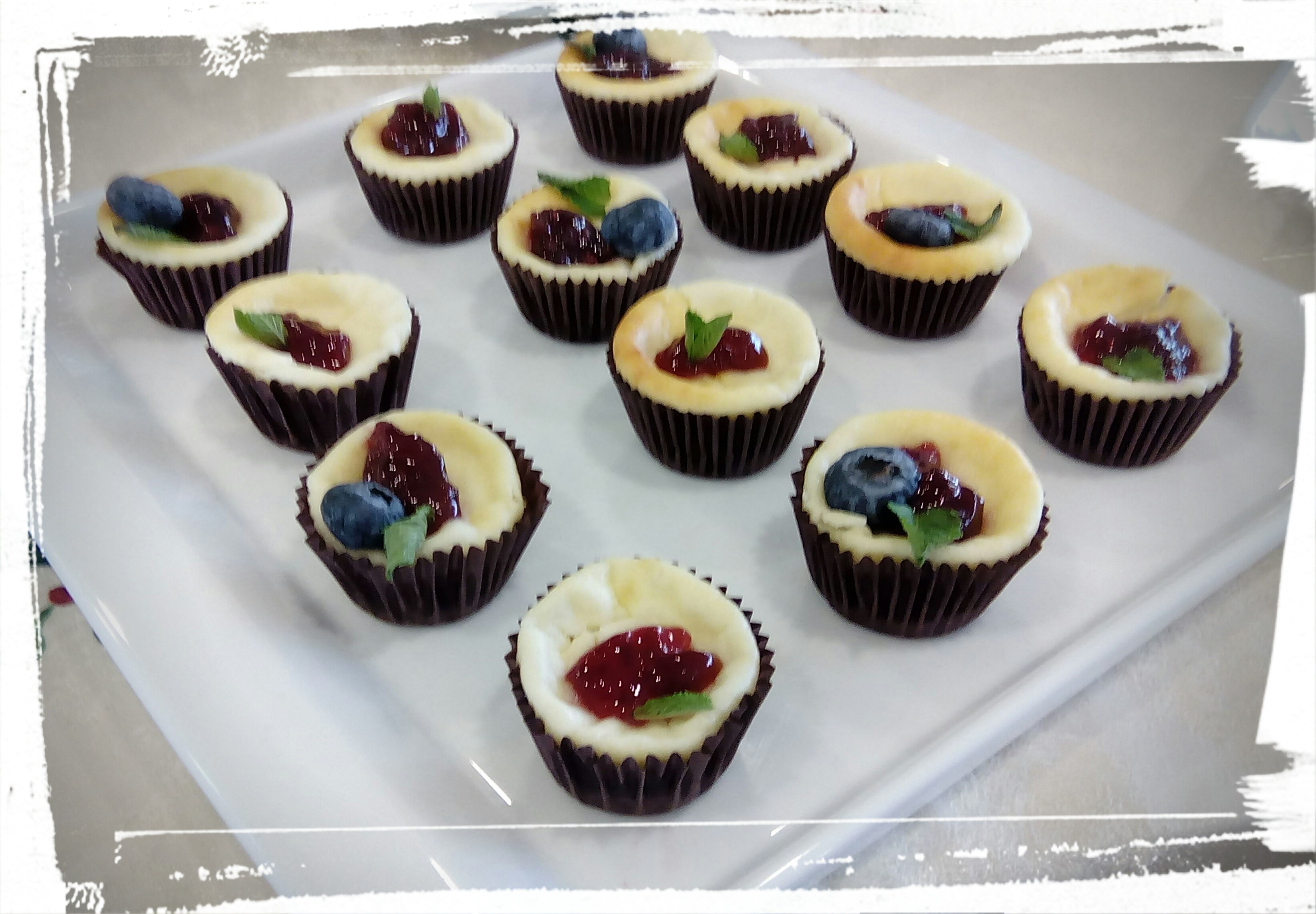 6. Hornee durante 20 minutos (180º). Retire del horno, deje enfriar (aprox. 1 hora) y desmolde despegando los bordes con un cuchillo o espátula fina.En el caso de las capsulas de papel, no hace falta desmoldar.. Ponga encima de cada cheesecake una cucharadita de mermelada de frambuesa y sirva.