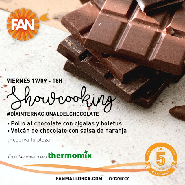 El viernes 17 de septiembre a las 18h realizaremos un showcooking de un plato salado y otro dulce utilizando como ingrediente principal el chocolate (ya que el día 13 de septiembre se celebra el Día Internacional de dicho producto) en la instalaciones de Fan Mallorca Shopping.