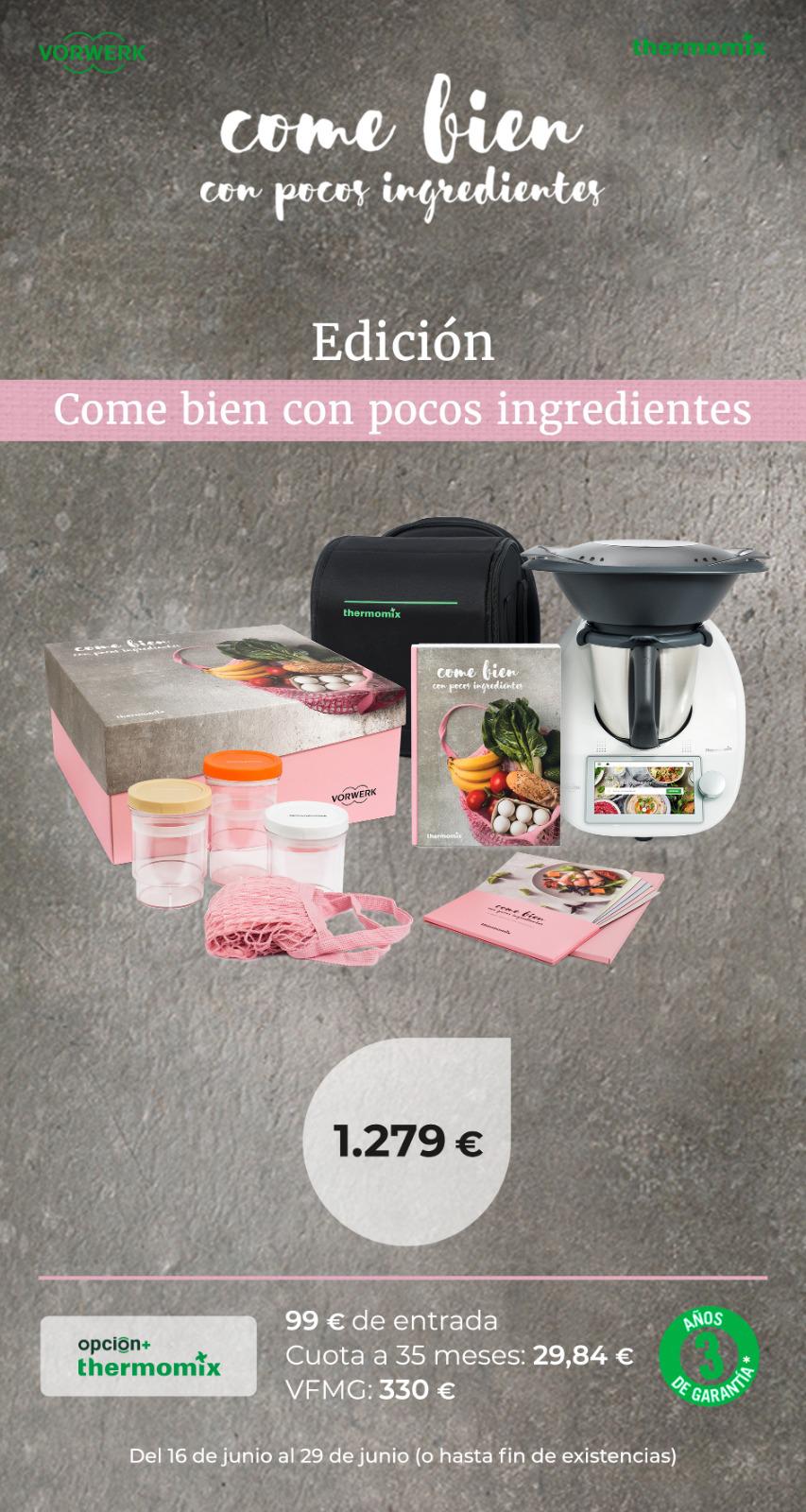 Contiene unos magníficos botes extensibles para que los alimentos se conserven en perfecto estado, ademas de la bolsa de transporte del Thermomix, una bolsa estupenda para ir a la compra, un libro con 80 recetas y unas fichas imantadas con menús semanales.