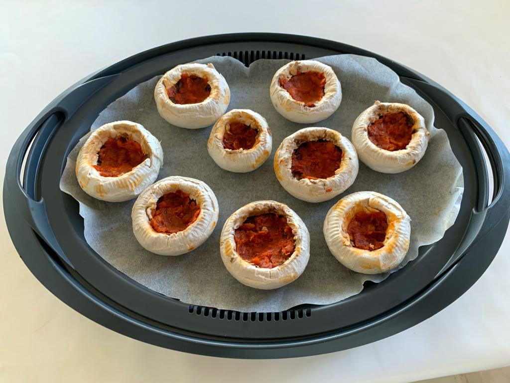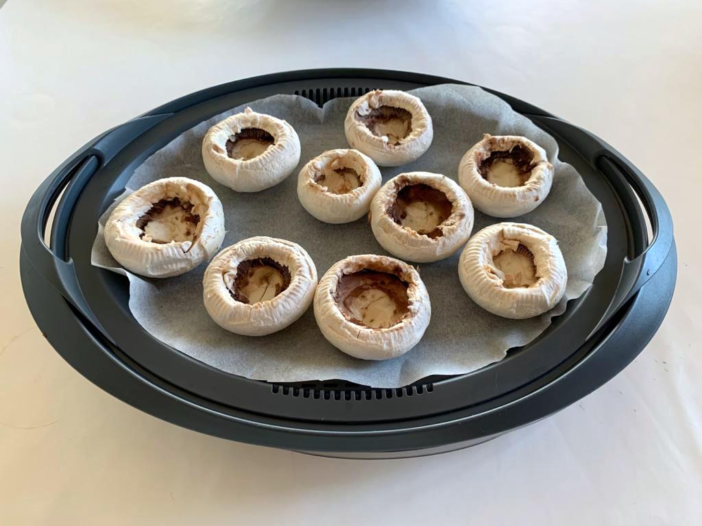 2. Forre la bandeja Varoma con papel de hornear y coloque los champiñones con el hueco hacia arriba. Meta un trozo de sobrasada y casque un huevo de codorniz dentro de cada champiñón. Coloque la bandeja en el Varoma, tape y reserve.