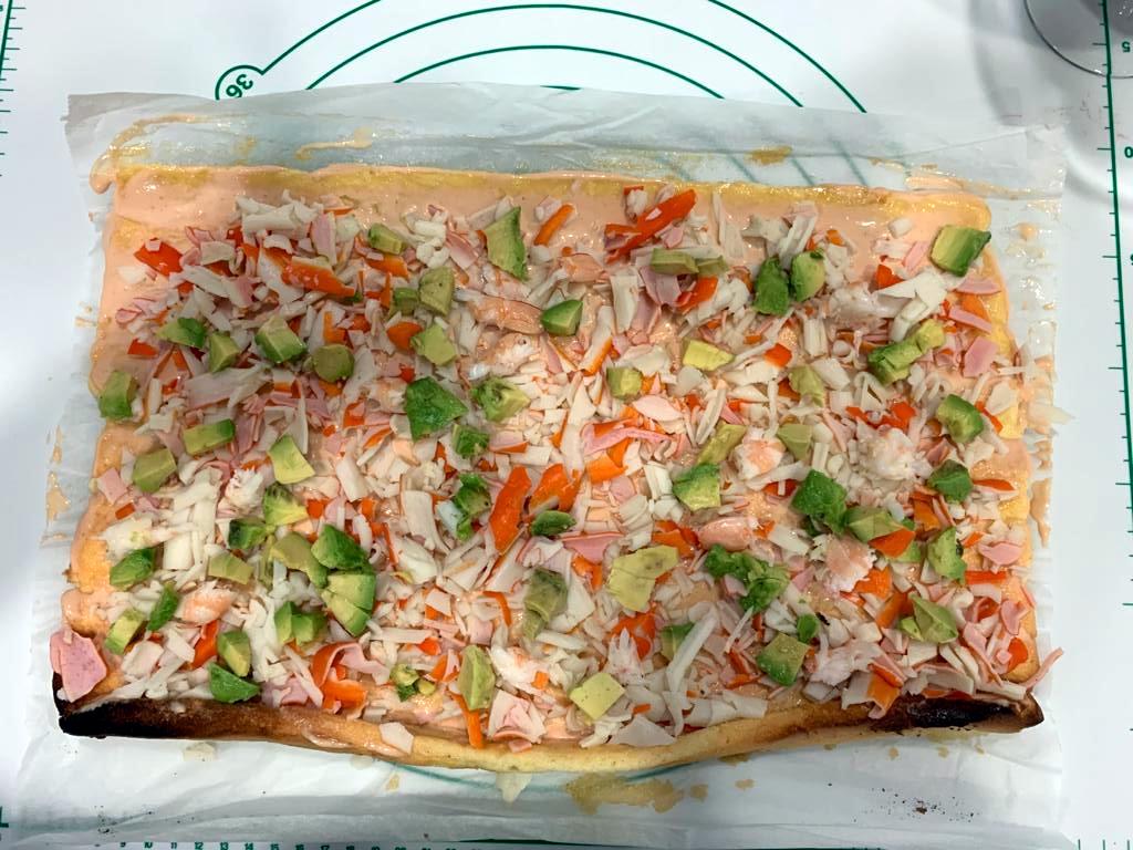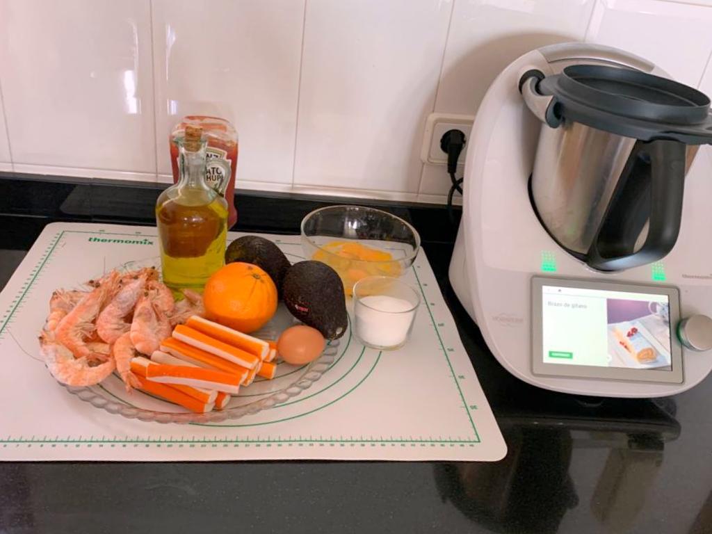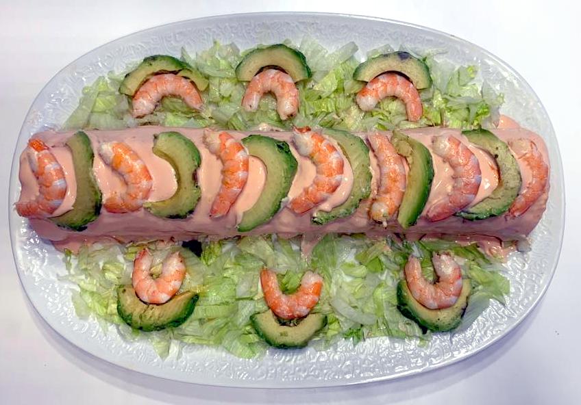 6. Desenrolle el bizcocho y úntelo con salsa cocktail. Cubra con palitos de cangrejo troceados (o con gambas y langostinos). Haga láminas finitas con el aguacate y póngalas sobre los palitos. Vuelva a enrollar apretándolo y déjelo en el frigorífico bien envuelto en papel de aluminio o film transparente. Antes de servirlo, cubra con la salsa cocktail restante y adórnelo a su gusto.