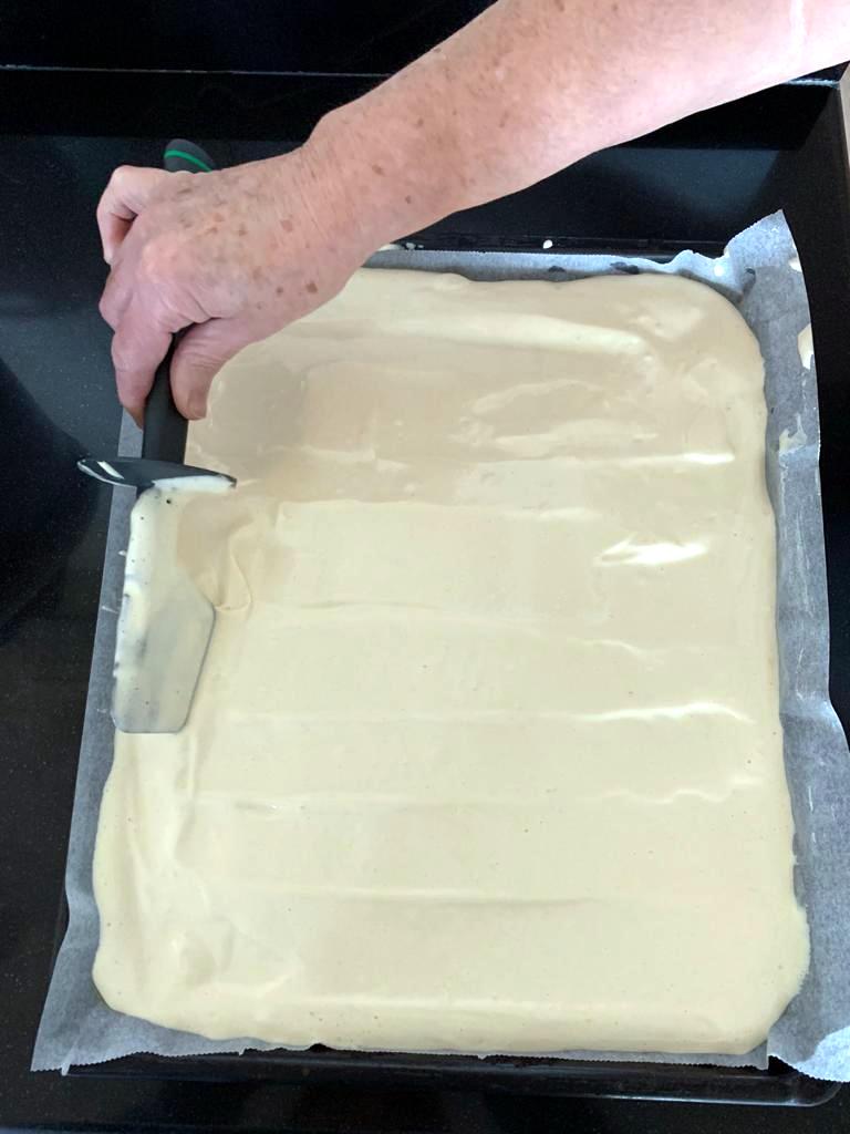 4. Forre la bandeja del horno con papel de hornear o lámina de silicona. Vierta la mezcla en la misma y extiéndala bien.