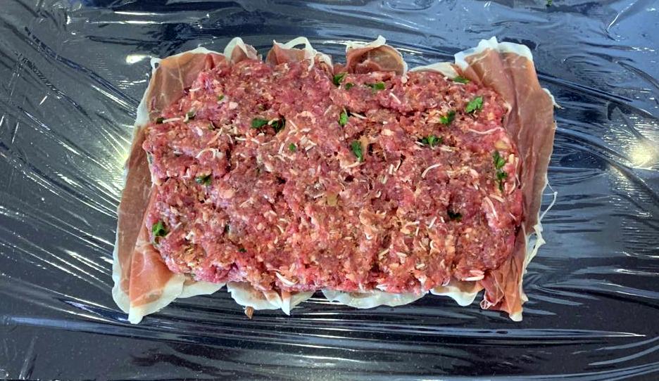 4. Ponga las lonchas de beicon en vertical formando un rectángulo sobre una doble capa de film transparente. Extienda la mezcla de carne encima dejando libre 3-4 cm del lado superior.