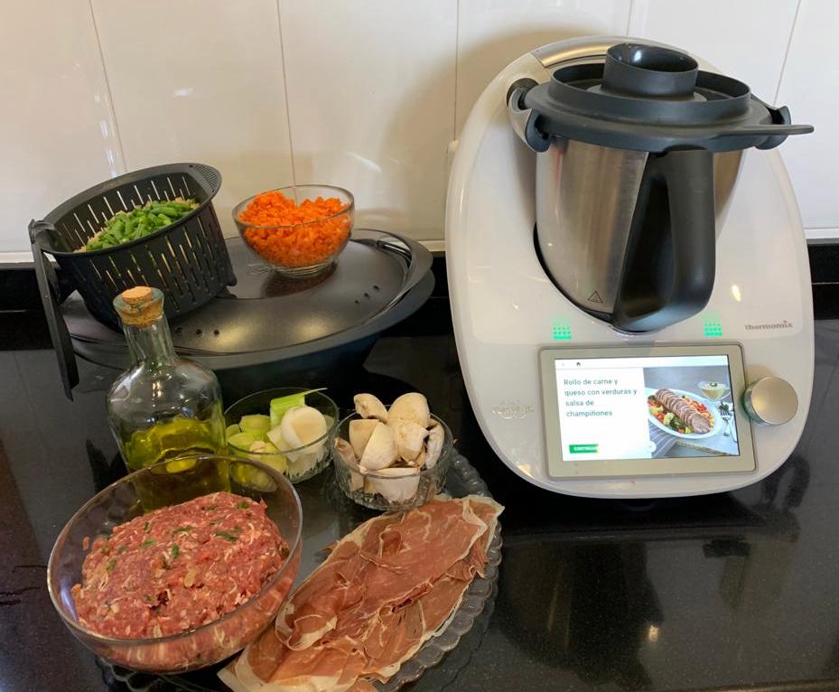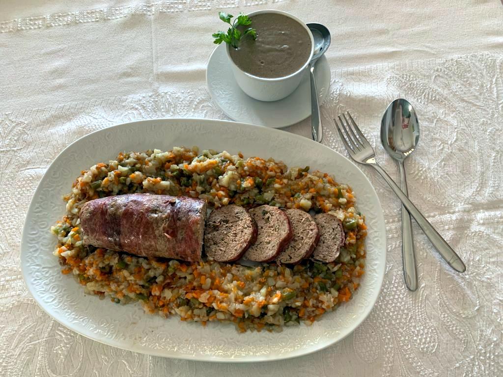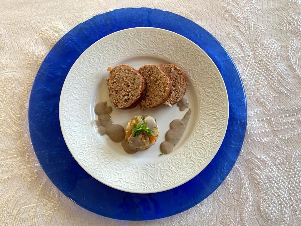 ROLLO DE CARNE Y QUESO CON VERDURAS Y SALSA DE CHAMPIÑONES