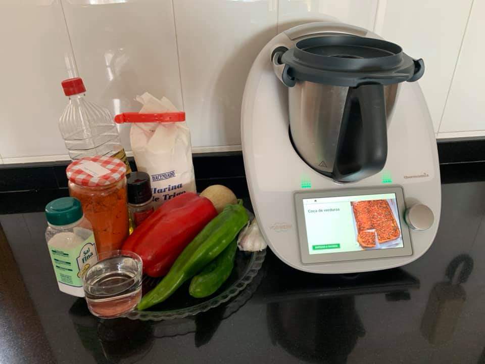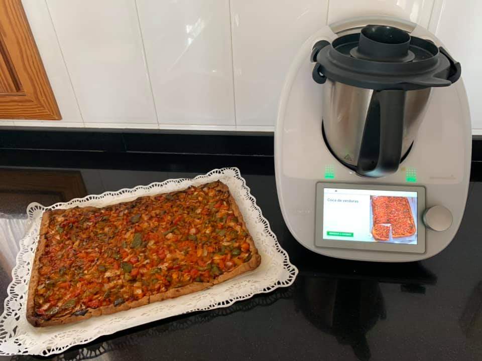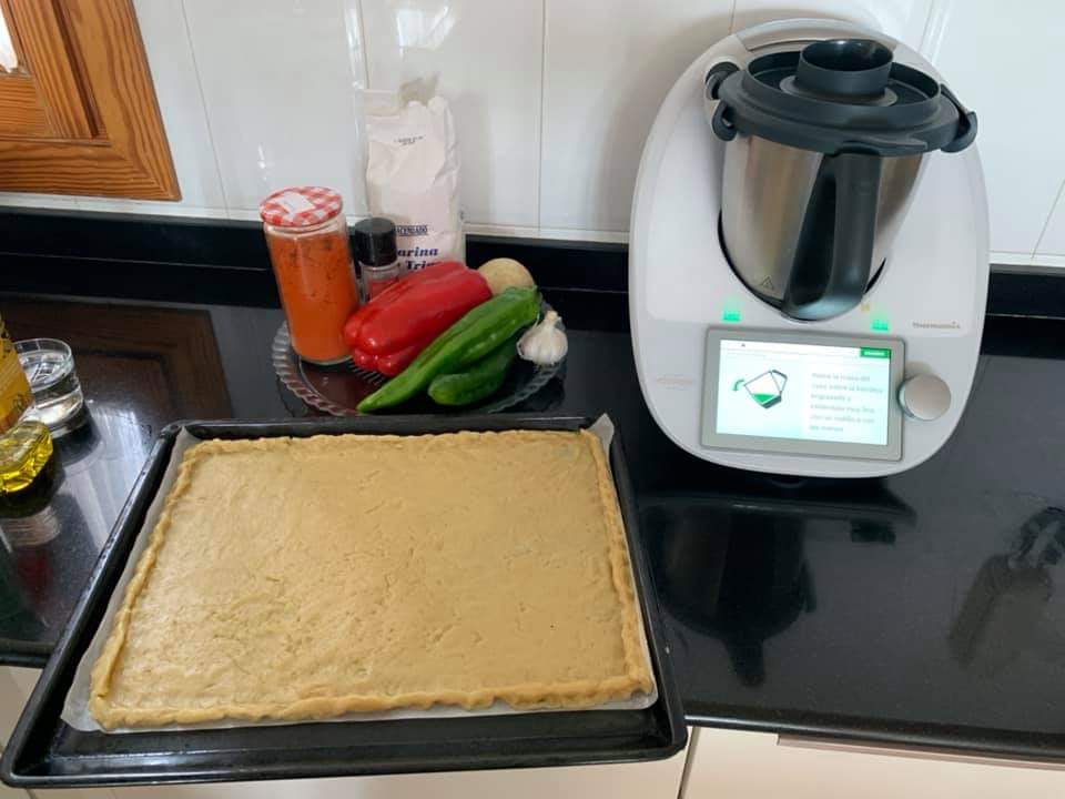 1. Ponga en el vaso el pimiento rojo y el verde, la cebolla, el calabacín, el aceite, la sal y el pimentón. Trocee 3 seg/vel 4. Cubra la masa con las verduras y hornee (200ºC) durante 20 minutos aproximadamente. Sirva caliente o fría.