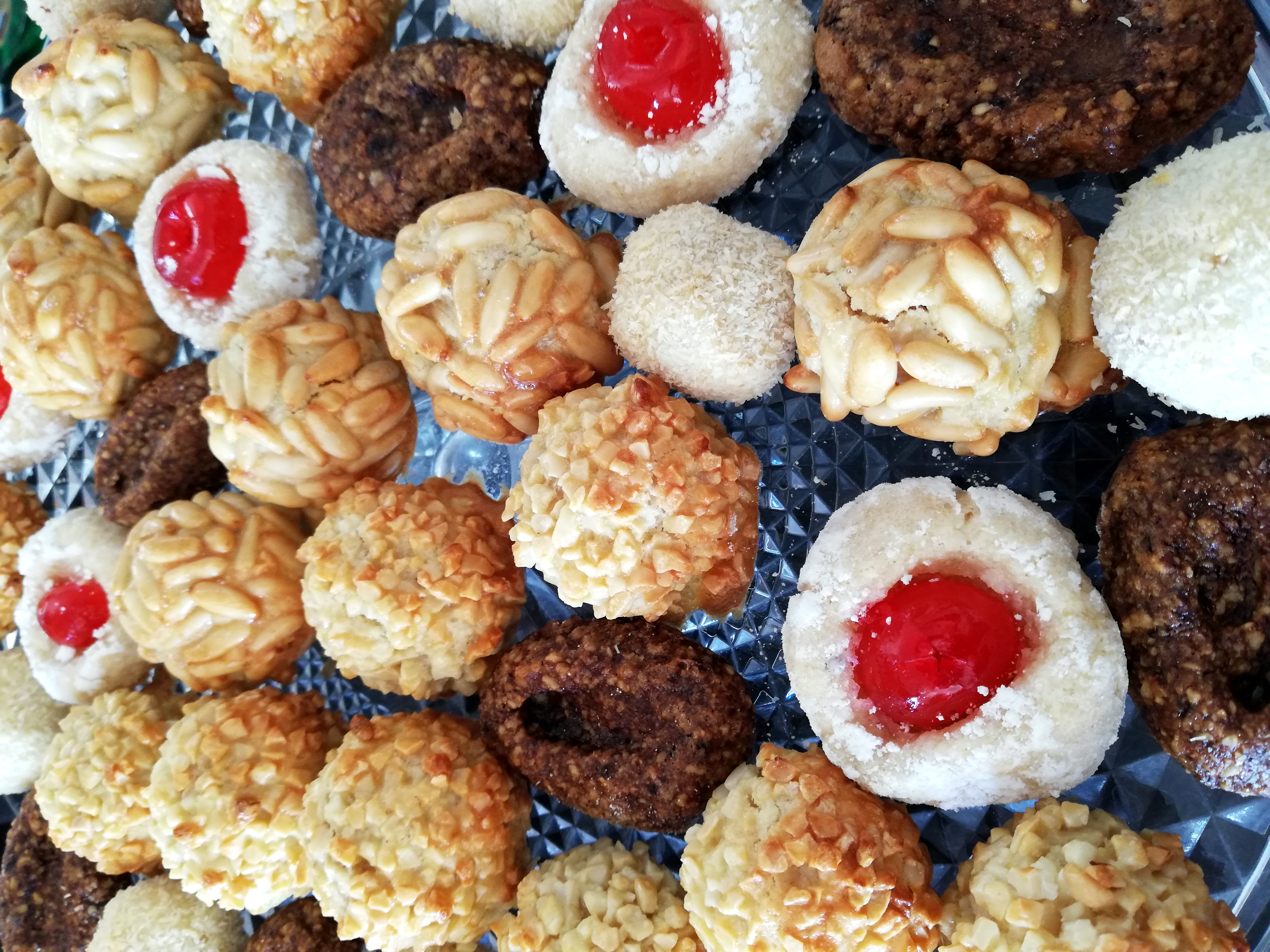 8. Forme las últimas 10 bolas del tamaño de una nuez y rebócelas en el azúcar glas. Colóquelas en la bandeja, aplaste con el dedo índice en el centro y ponga ½ guinda en cada hueco.