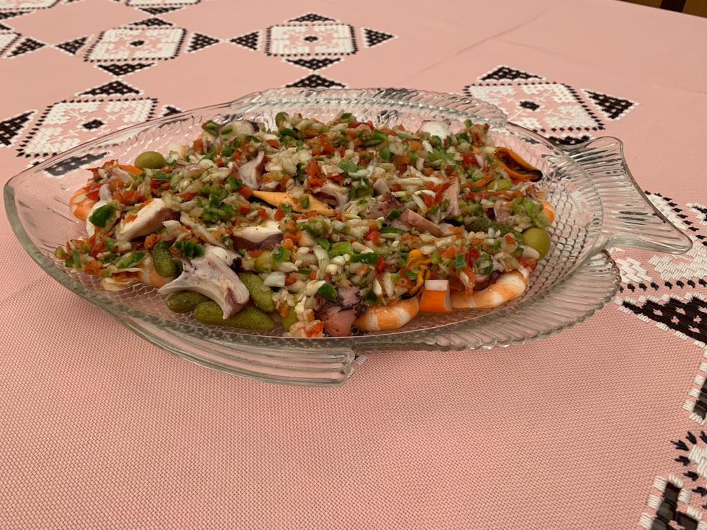 1. Vierta el agua en el vaso, sitúe el recipiente Varoma en su posición con los mejillones, tape y programe 12 min/Varoma/vel 1. Retire el Varoma, separe los cuerpos de los mejillones y deseche de las valvas. Con unas tijeras, corte los restos de barbas si los tuviera. Reserve los cuerpos en un bol grande o ensaladera. Incorpore al bol el pulpo, los langostinos pelados, los pepinillos y las aceitunas y reserve. Vacíe y lave el vaso.