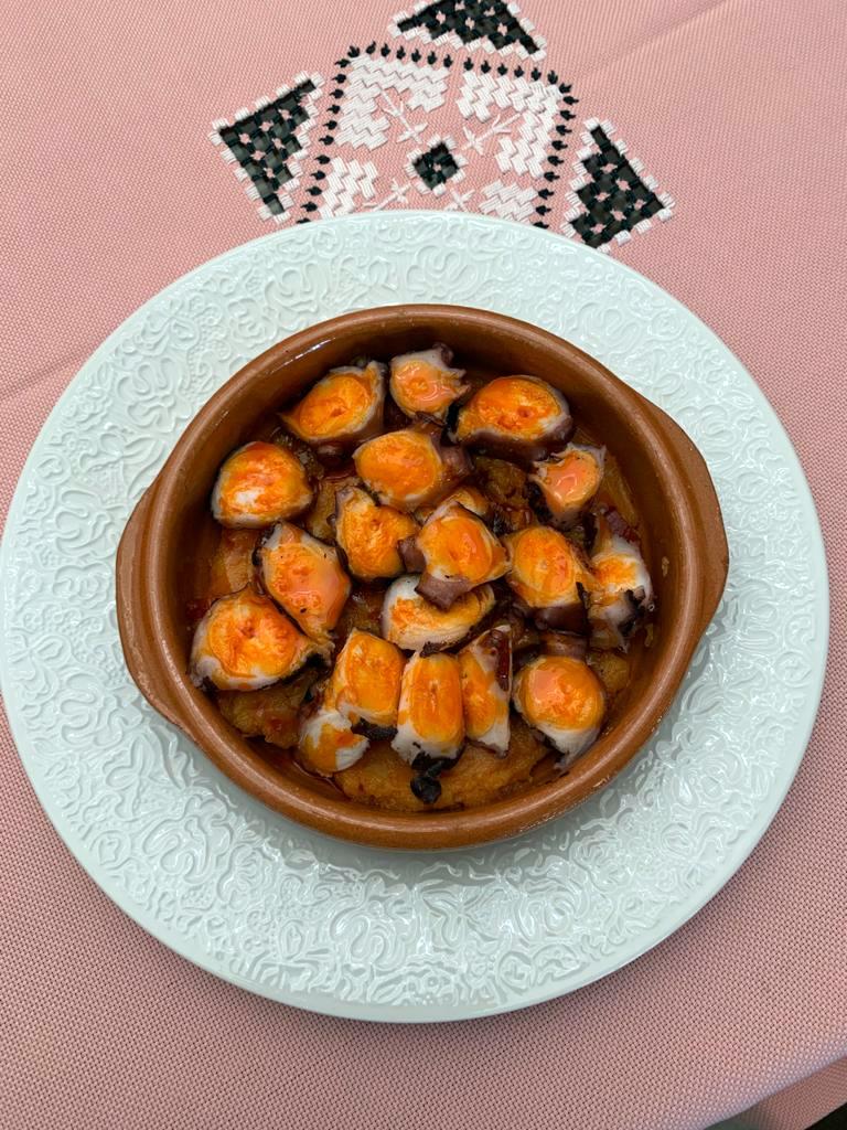 6. Coloque la mariposa en las cuchillas, incorpore las patatas cocidas y triture 15 seg/vel 3. Reparta las patatas revolconas en 6 cazuelas individuales, coloque el pulpo encima, espolvoree con sal en escamas y pimentón y riegue con un chorrito de aceite. Sirva inmediatamente.