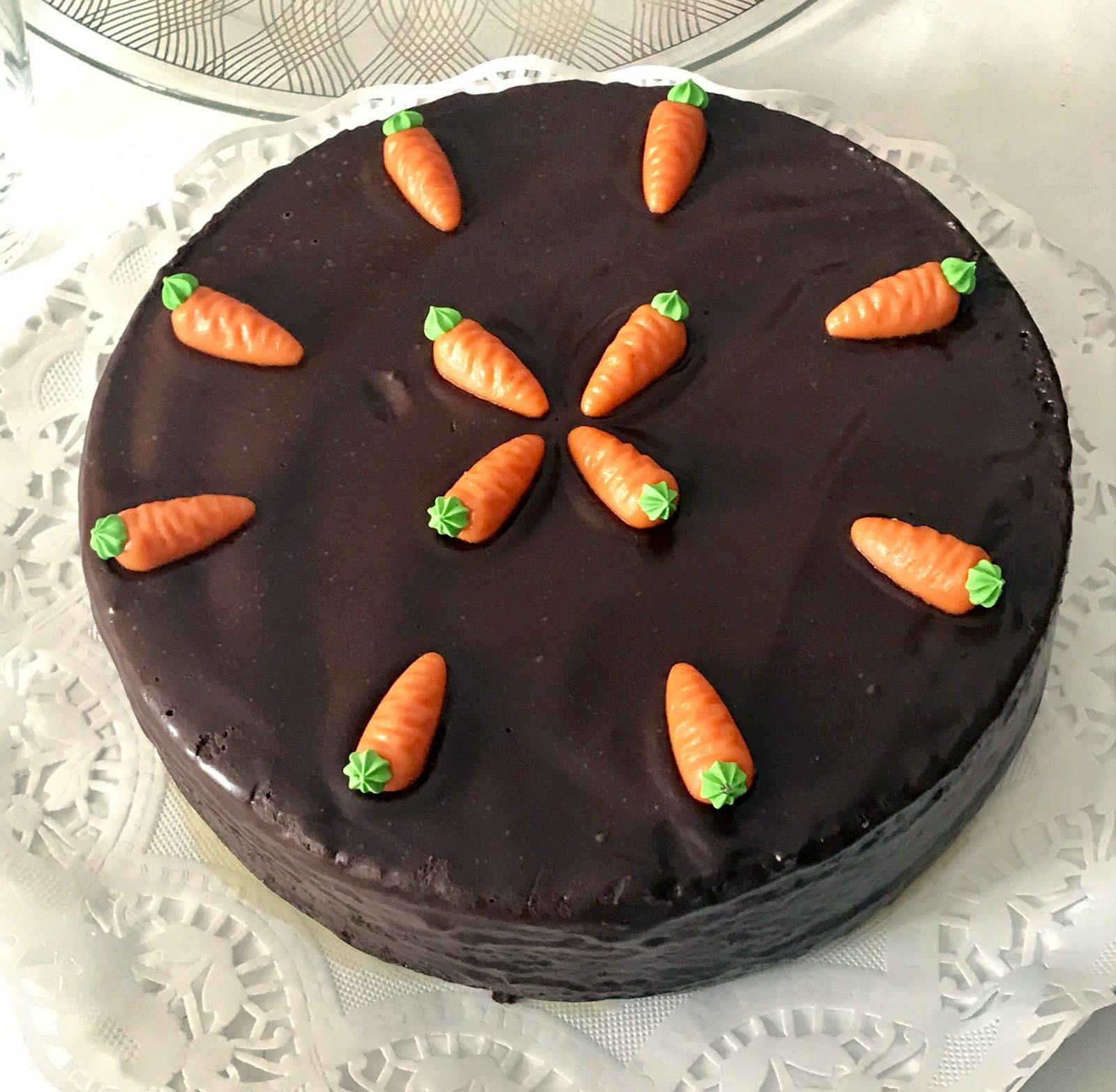 La primera foto es el bizcocho con una cobertura de chocolate negro y zanahorias de mazapán para decorar.