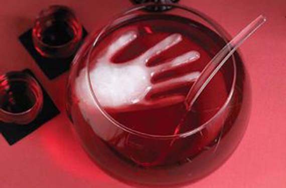 *Hacer un ponche encantado: llenar un guante de plástico con refresco de limonada, lima u otro líquido para crear una espeluznante mano que flote en la ponchera.Utilizar una cinta de goma resistente para cerrar bien el guante.Utilizar un plato de plástico para asegurar el extremo del guante en el congelador. Congelar hasta que se solidifique, quitar el guante y dejar la mano flotando en la ponchera.