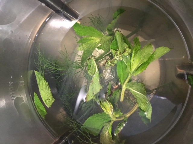 - En el vaso ponemos la mitad de las hierbas aromáticas. Colocamos el cestillo en su posición y echamos los caracoles . Vertemos el agua , ponemos un poco de sal y tapamos .