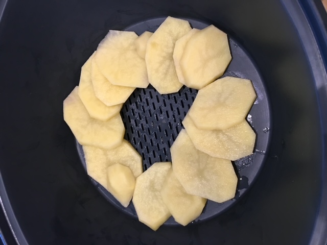 En el recipiente Varoma , colocamos 200g de patata cortada a rodajas y las colocamos en el recipiente . Tapamos y ponemos el varoma en su posición .