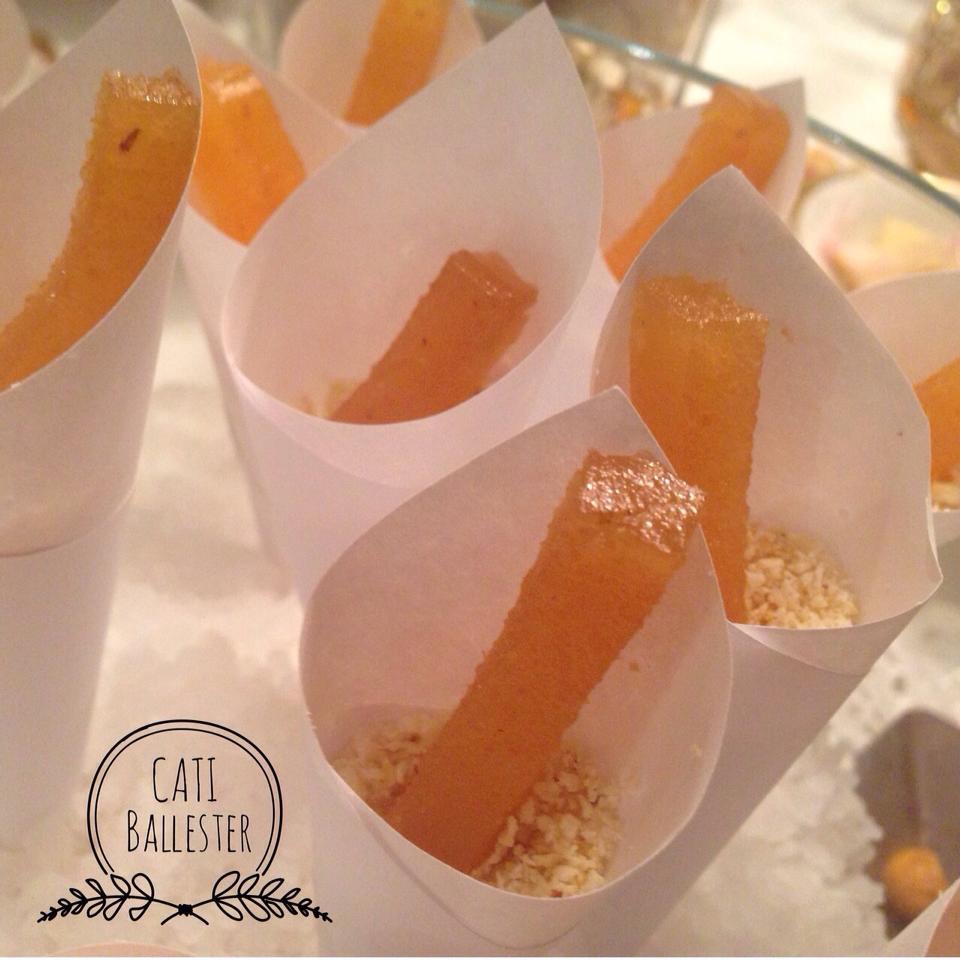 4- Ponga 2 cucharaditas de la mezcla en los cucuruchos de papel y adorne con unas tiras del dulce de menbrillo . Sirva de aperitivo sobre un chupito o acompañado de una bebída .