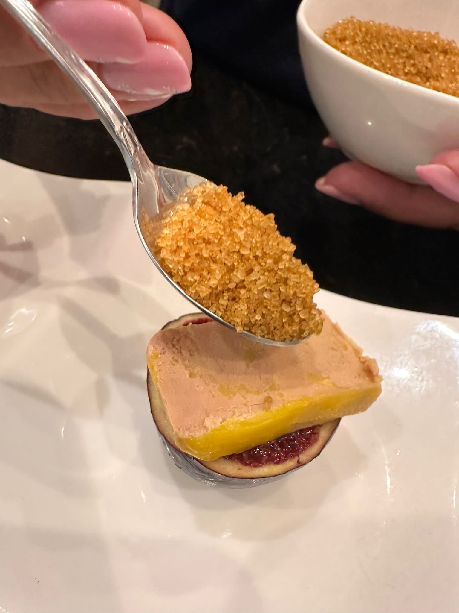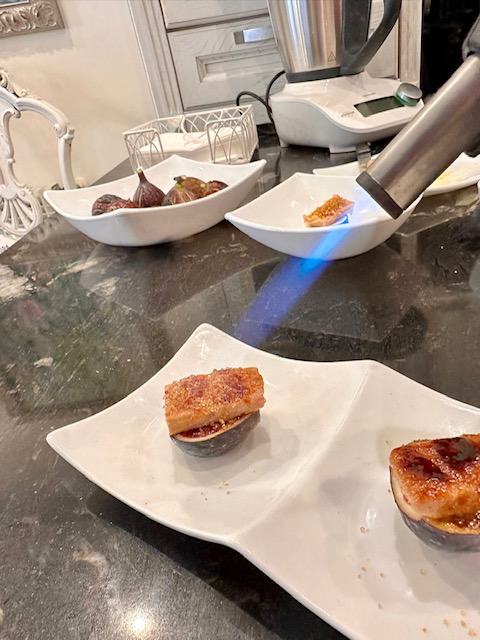 Aquí vemos como hemos partido por la mitad el higo , ponemos un trocito de foie , una cucharadita de azúcar Moreno , y un soplete para caramelizarlo ,una exquisitez .