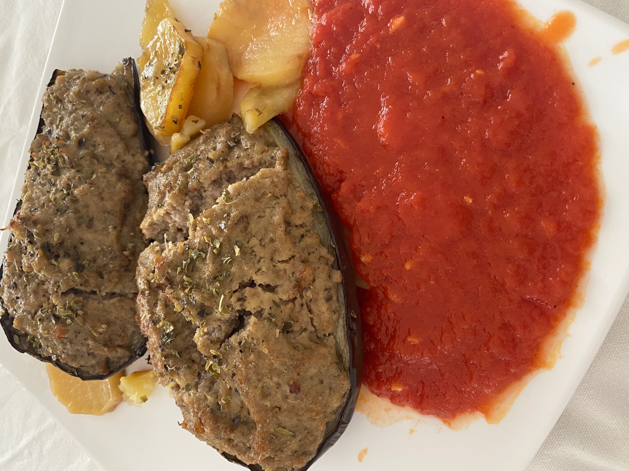 - Colocamos las patatas en el fondo de una bandeja apta para el Horno. Encima colocaremos las Berengenas rellenas de la carne que tenemos reservada . Las espolvoreamos con un poco de oregano seco , y las pondremos en el Horno . Que lo tendremos precalentado a 200º. Unos 20 minutos . Sacamos y servimos con la salsa de tomate en una salsera .
