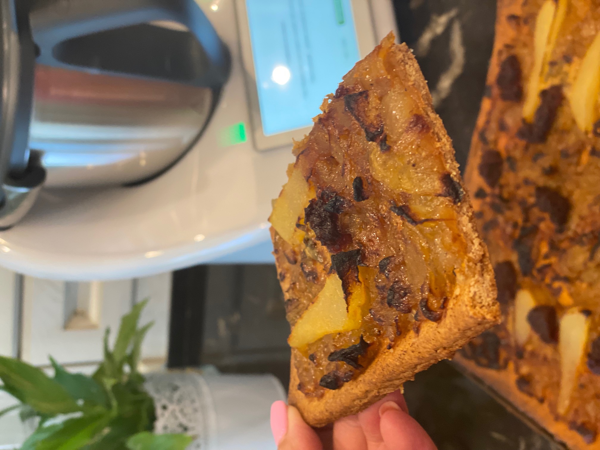 Una cebolla caramelizada en su punto , acompañada de trocitos de pera , roquefort y un toque de sobrasada picante sobre una base crujiente de coca con harina integral.