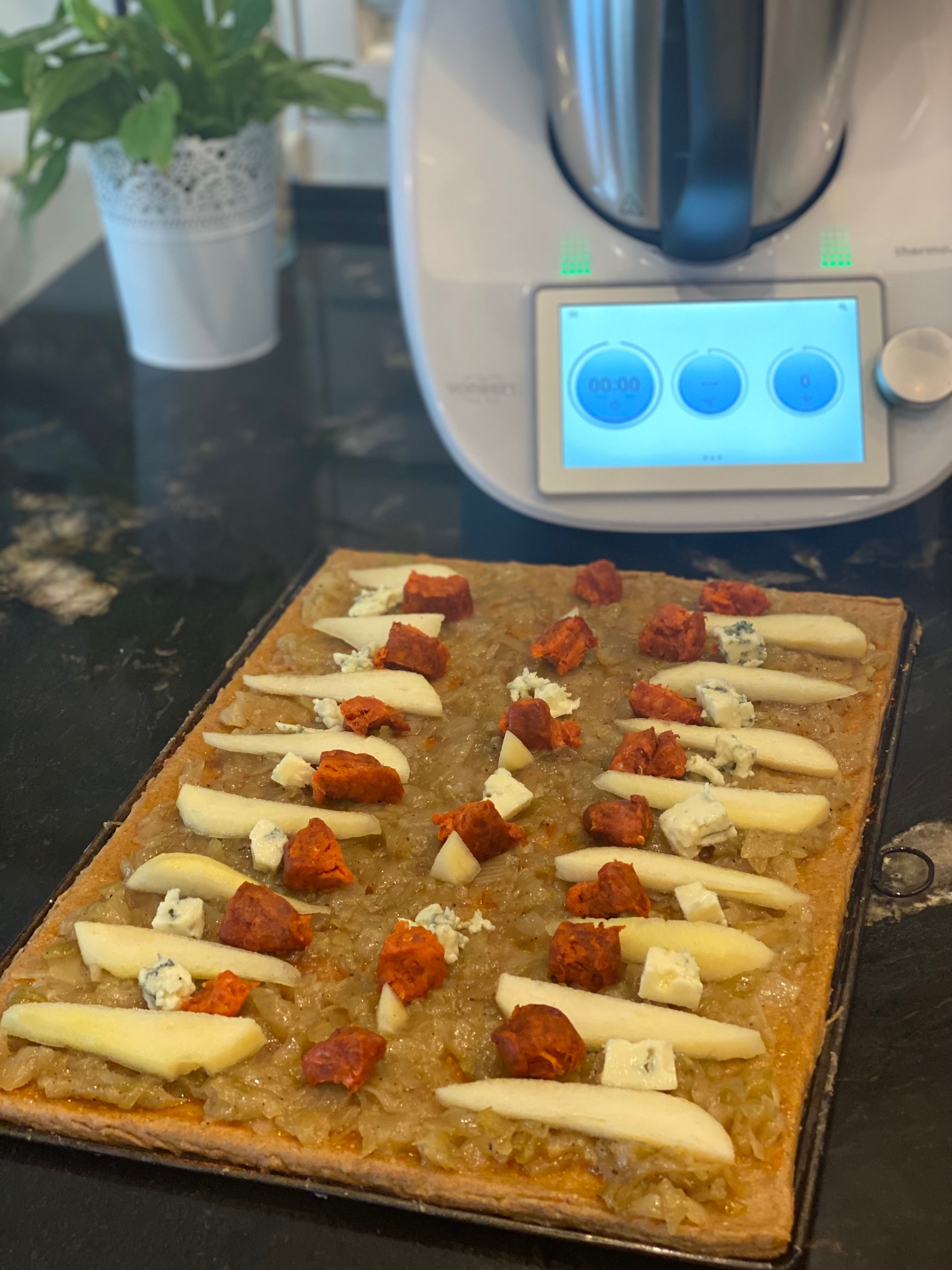 COCA DE CEBOLLA CARAMELIZADA , PERA , ROQUEFORT Y SOBRASADA .