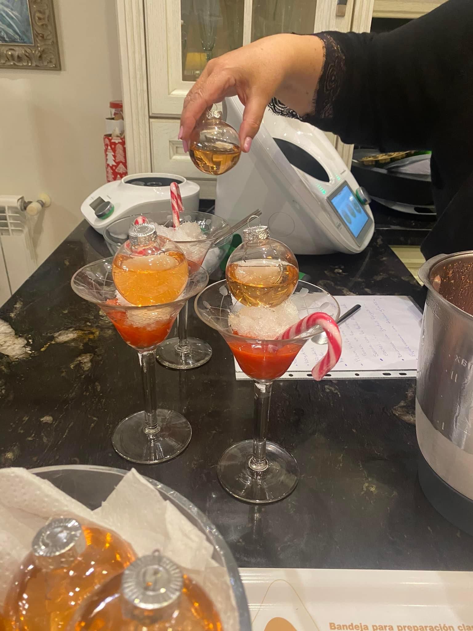 Las rellenaremos de cava rosado y en una copa pondremos sorbete de fresa, hielo picado , encima la bola con cava , un bastón de caramelo y voilá! ya tenemos un Spritz festivo 100% Navideno.