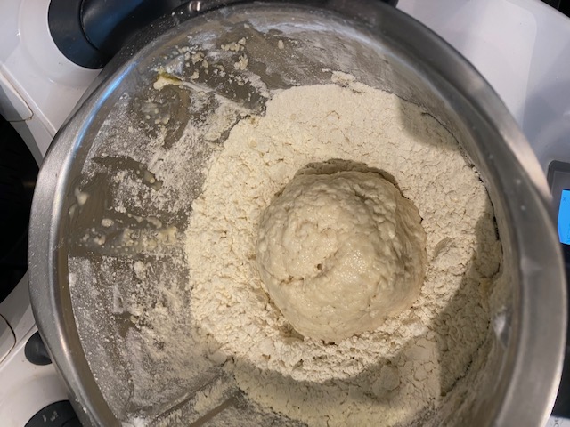 A continuación amasamos 3 minutos velocidad espiga . Sin el cubilete para que entre el aire en la masa . Comprobar que la masa se mueve formando una bola .