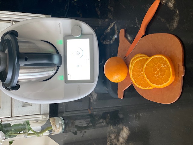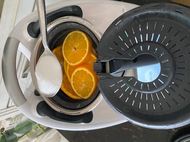 3- Colocamos las naranjas en el cestillo y cubrimos de agua dentro del vaso . Añadimos el bicarbonato , y programamos 20 minutos temperatura varoma , velocidad 1 .