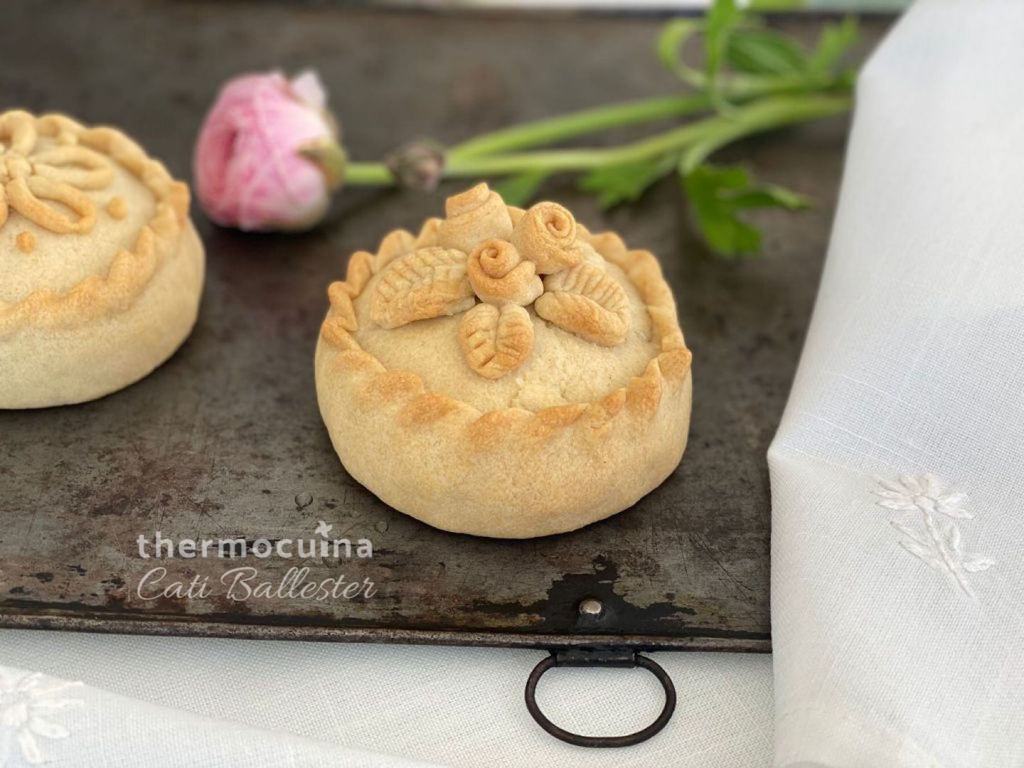 Las PANADES SENYORIALS, así las he querido llamar , son unas panades hechas con cordero y coronadas con confitura de cabello de ángel . Una panada que una vez tapada adornamos con flores de pasta para anunciar que en su interior esconden algo maravilloso .