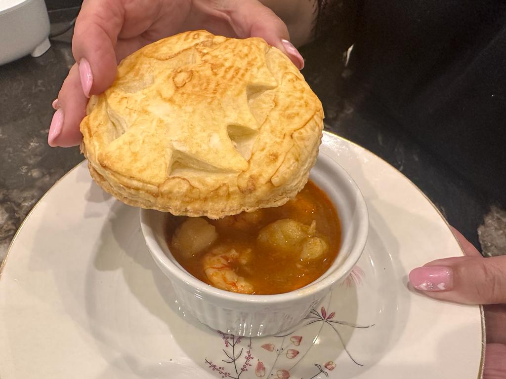 Crema de rape y gambas cubierta en hojaldre