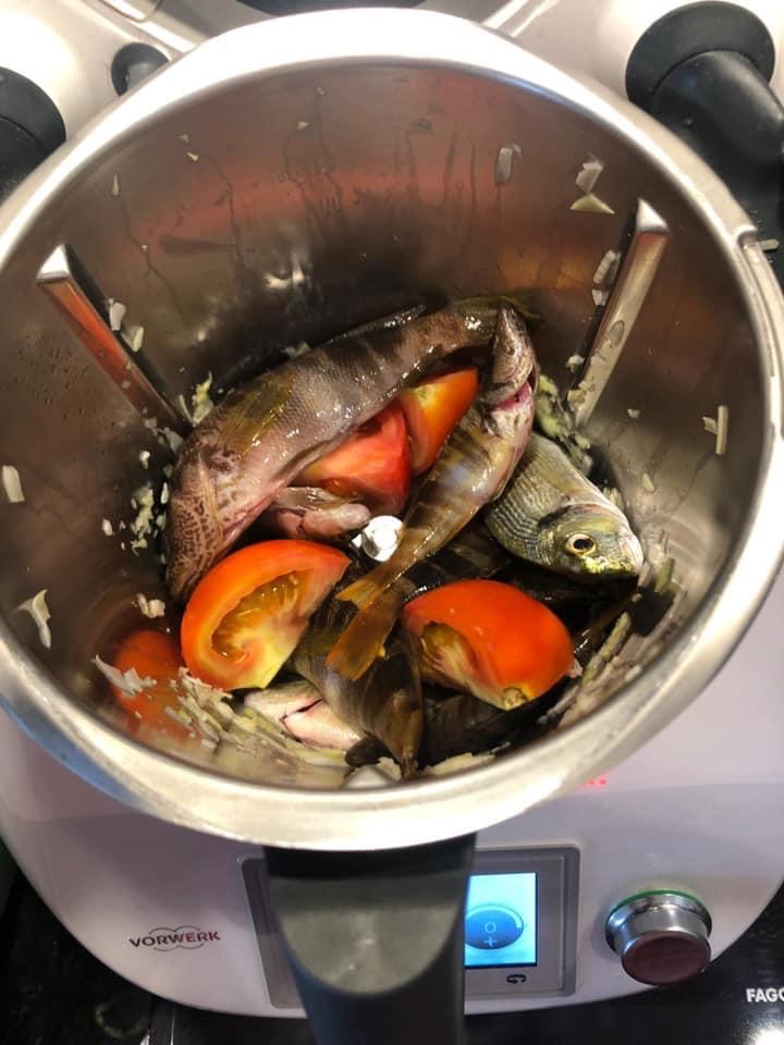 Tenemos el privilegio de vivir en una casita delante del mar, donde por la mañana a primera hora , salimos con la caña a pescar a la orilla , así , con pescado fresco y del día , que con thermomix tenemos la ventaja que con poquita cantidad nos saldrá un caldo exquisito . Pero no os apuréis , que quien no pueda salir a pescar , también es muy fácil ir a la pescadería de confianza y comprar los ingredientes necesarios .
