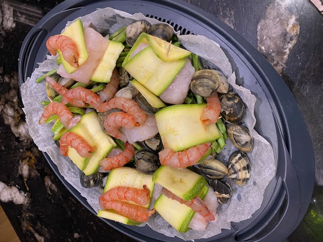 Hoy os traigo un plato rico rico , con unos medallones de rape envueltos en unas finas láminas de calabacín , unas gambitas , almejas y acompañados de unos espárragos , y todo envuelto en un fumet de gamba y vermut , irresistible !! Y lo mejor de todo es que en 30 minutos lo tendremos todo preparado y listo para comer . ¿Que os parece la idea ? Seguro que lo vais a repetir más de una vez ….