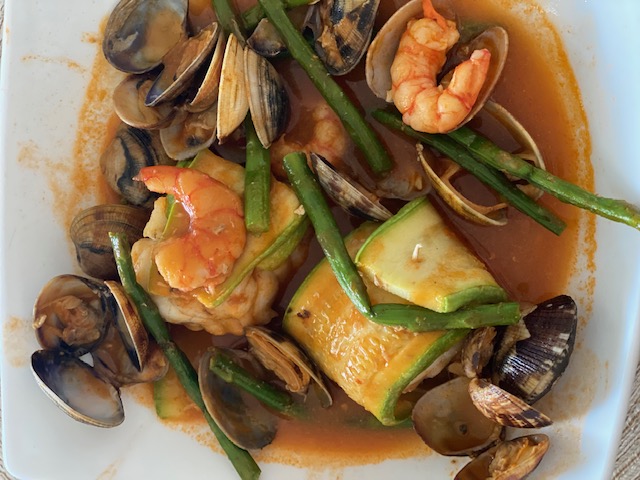 RECETA DE VERANO : RAPE , AMEJAS , GAMBAS Y UNA COPITA DE VERMOUTH.