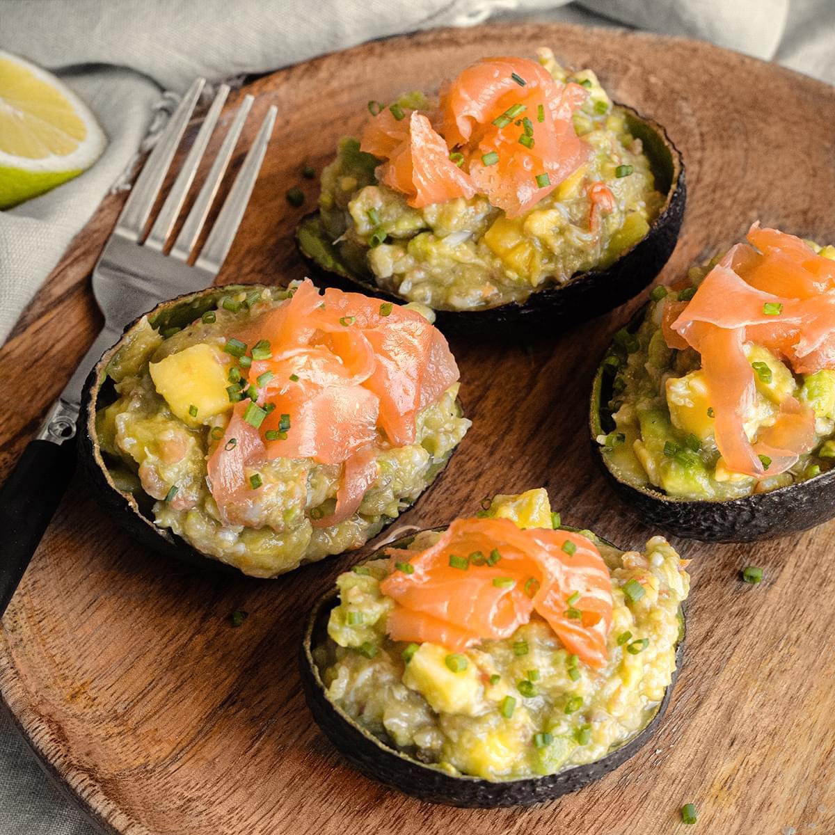 RECETA REFRESCANTE : AGUACATES RELLENOS DE MANGO Y LANGOSTINOS .