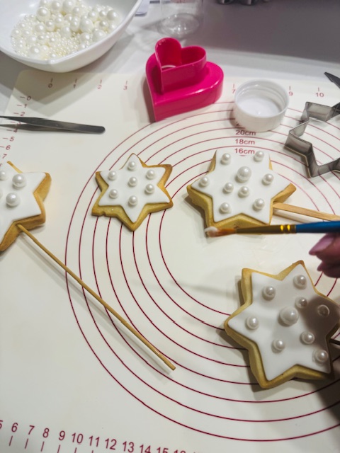Luego he utilizado glasa real en color blanco , perlas comestibles , fondant para hacer copos de nieve y flores , y me encanta el resultado final , y es que cuando se Trabaja con mucho amor , se optienen unos bonitos resultados .