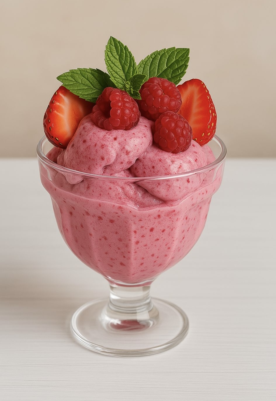 Y así nació este helado de dos ingredientes: frutas rojas congeladas (fresas, frambuesas…) y plátano maduro. Nada más. Sin azúcar añadido. Solo el dulzor natural de la fruta y una textura cremosa que sorprende y encanta. Una opción ideal para refrescarse sin remordimientos, perfecta para grandes y pequeños.