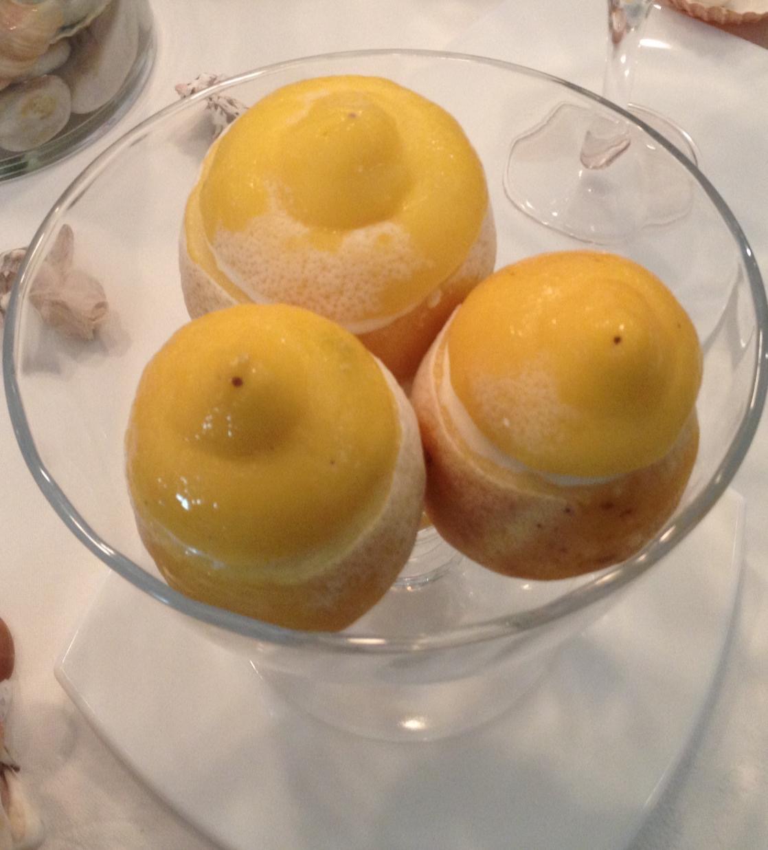 Luego con la ayuda de la espátula rellenamos los limones , y los metemos al congelador con las tazas de cafe , así se nos aguantarán facilmente , al cabo de unas horas , los sacamos les ponemos su tapa correspondiente y los envolvemos con papel film transparente , y con la ayuda de una cinta los atamos . Luego los volvemos a colocar en el congelador.