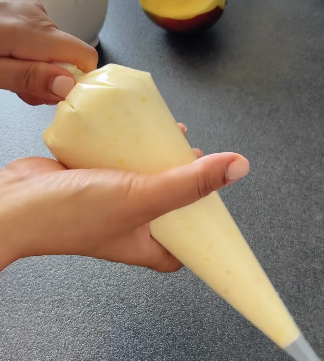 Ponemos la crema en una manga pastelera y guardamos en la nevera . Para que este bien fresquita .