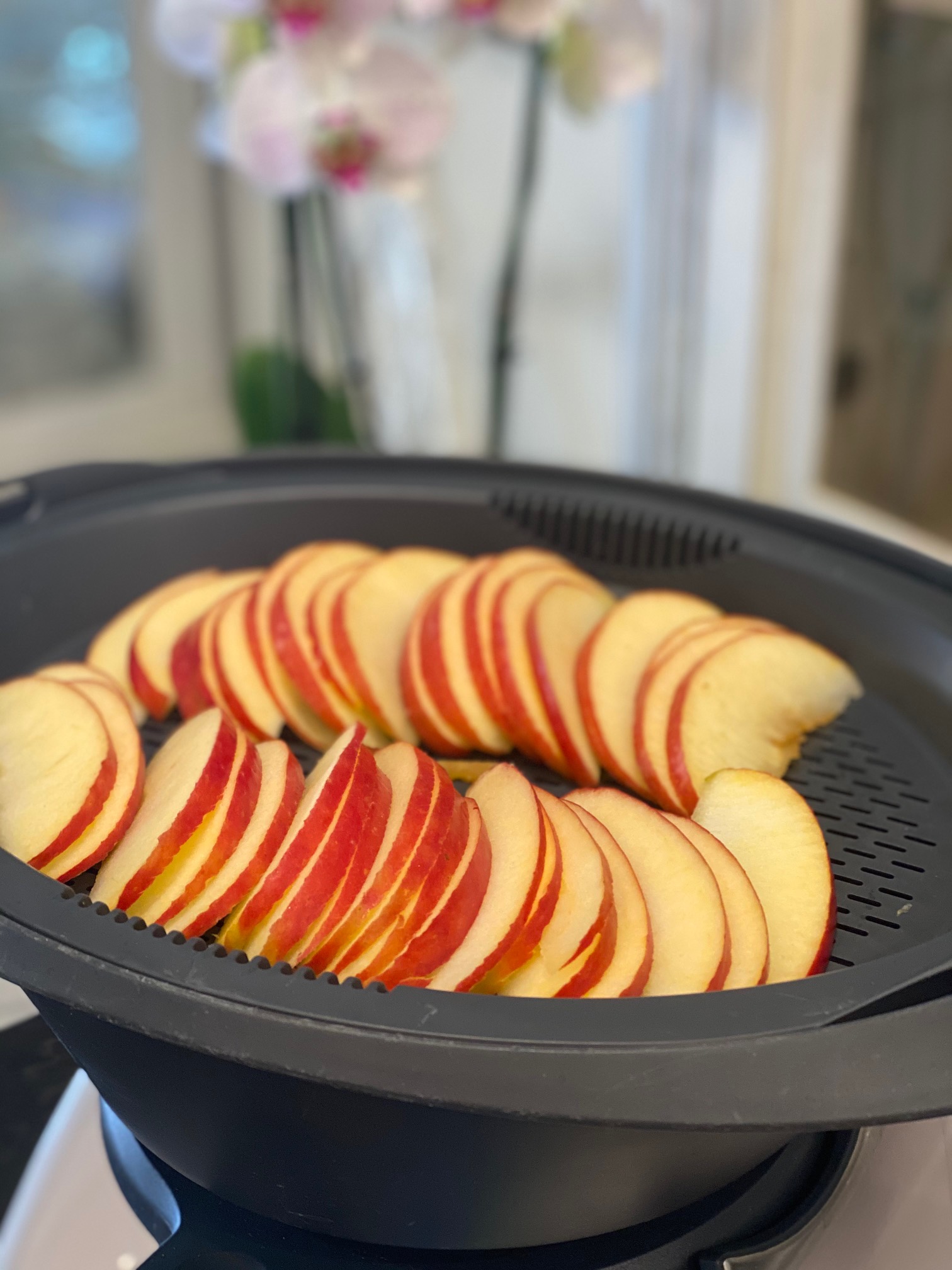 - Ponemos en el vaso el agua y el vino . Colocamos las láminas de manzana en la bandeja del recipiente varoma , tape y sitúelo en su posición . Programe 15 minutos , temperatura Varoma , velocidad 1.