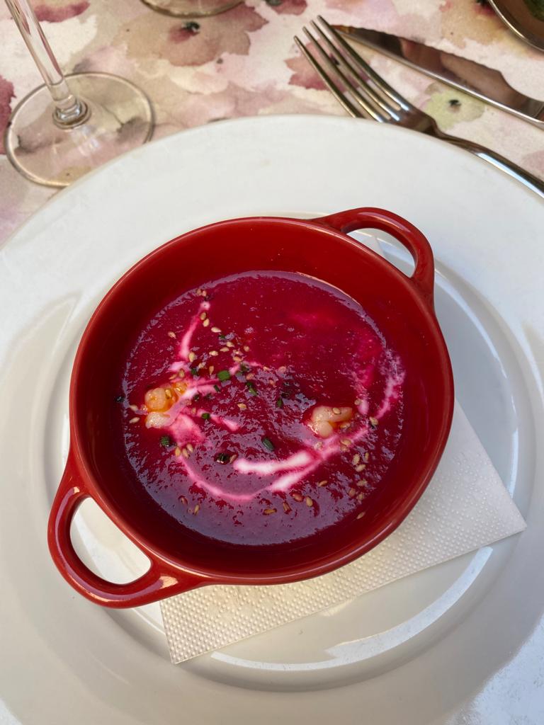 He de deciros que este GAZPACHO me llamó la atención por su color fuccia intenso . El rosa es uno de mis colores preferidos , quién me conoce lo sabé bién , y no pude resistime a la tentación de prepararlo en casa y dar mi toque personal , un poco de queso feta , que al mezclar nos da este abanico de tonalidades rosas que tanto me gustán , un poquito de cebollino que le da este toque de frescura y una cucharadita de ajonjolí le da este toque crunch . Un placer para todos los sentidos .¿ Te apetece probarlo ? Pues toma nota de los ingredientes y a por la receta …
