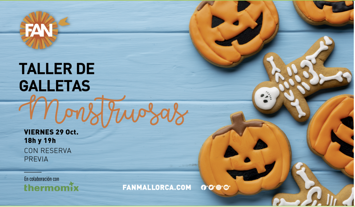 El viernes 29 de octubre a las 18h y a las 19h Ursula Mena y yo realizaremos un taller de galletas monstruosas de Halloween en las instalaciones de FAN Mallorca Vamos a celebrar Halloween uniendo gastronomía y diversión.