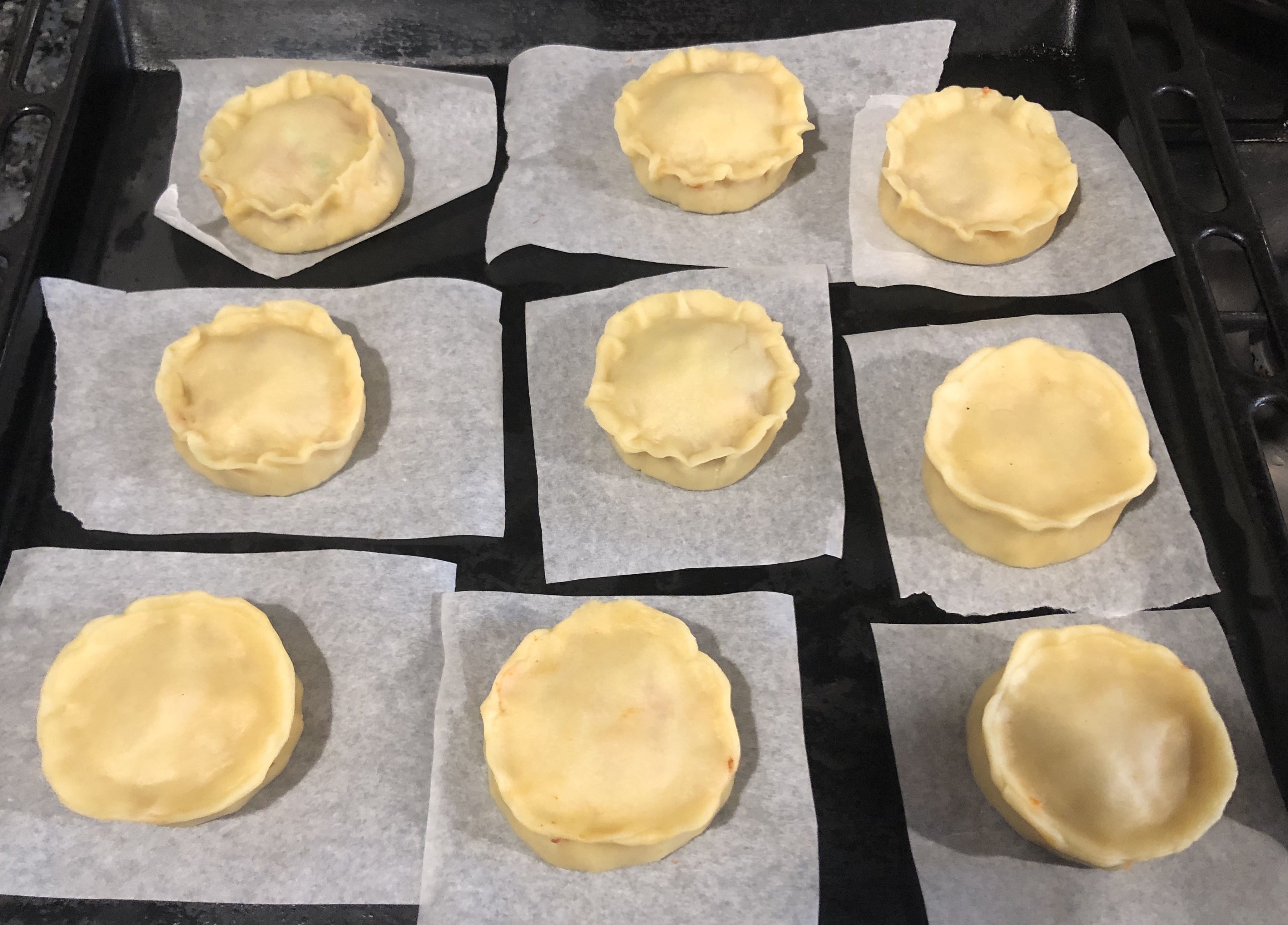 Colocamos una cucharada de carne, otra de guisantes, un par de trozos de panceta o tocino y un trocito de sobrasada. Formamos las tapas un poquito más grandes que la canasta, colocamos encima y sellamos formando un cordón o pellizcos. Colocamos sobre una bandeja forrada con papel de horneamos 30 minutos a 180ºC.