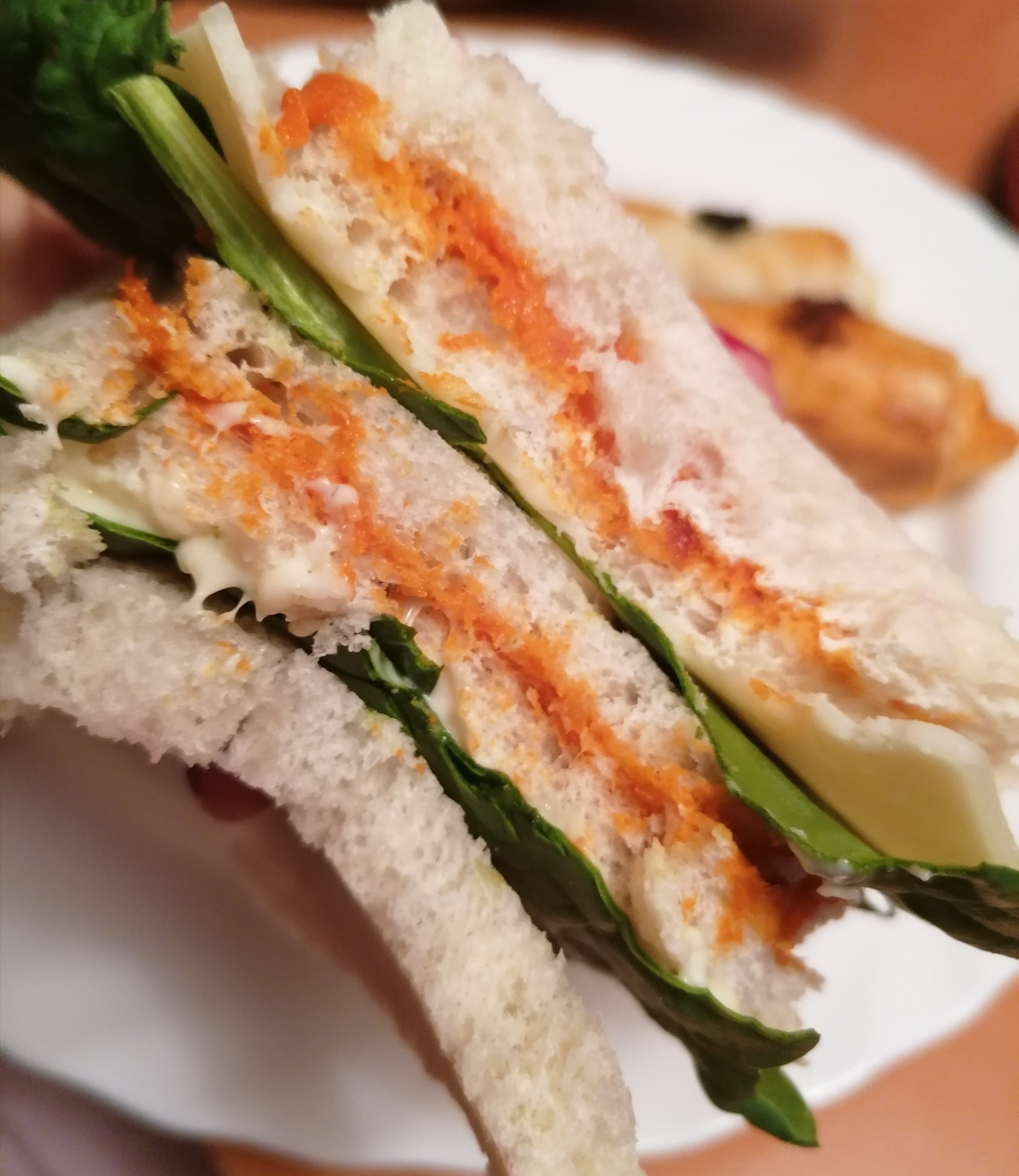 Vamos a untar en pan de molde, una de sobrasada, otra de camembert, con una hoja de espinacas, otra de sobrasada y la siguiente queso mahones y vuelta de espinacas. La combinación a gusto.