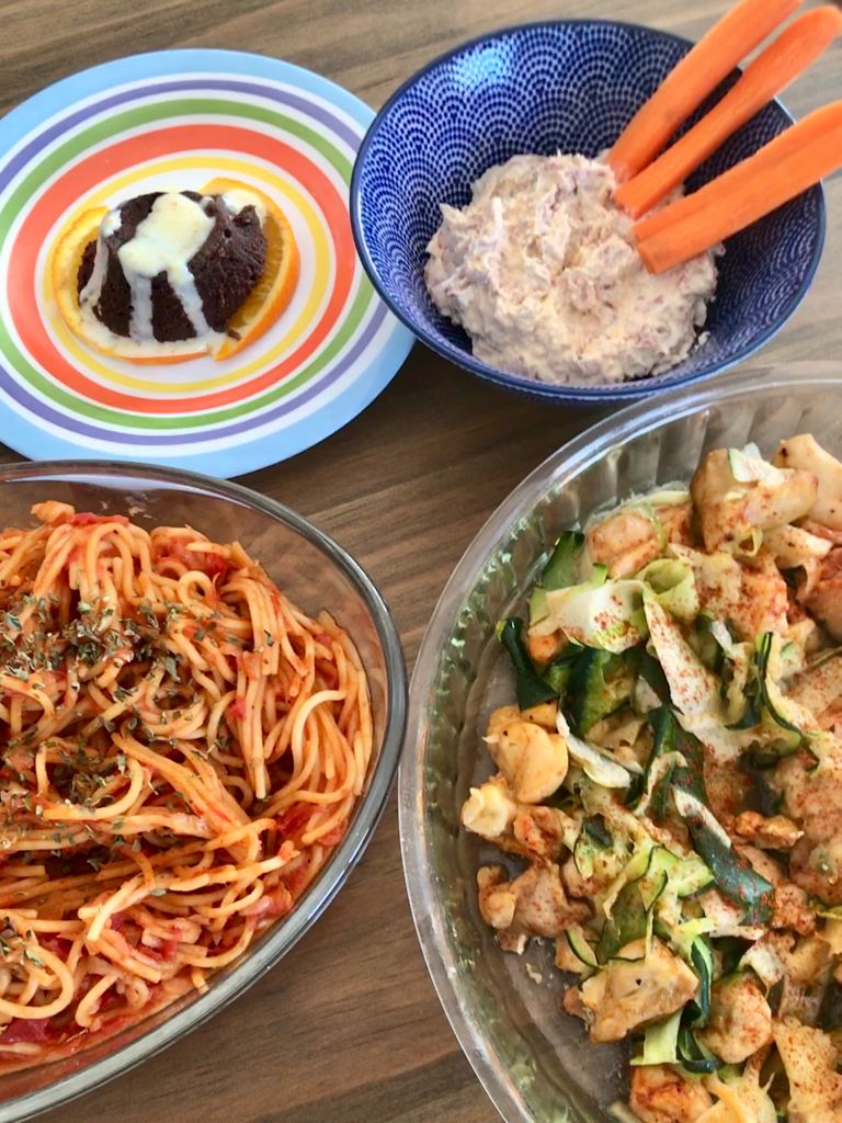 Primero vamos a elaborar un dip de philadelphia con jamón , después vamos a hacer unos espaguetis con tomate y al mismo tiempo haremos pollo y calabacín en el varoma. De postre en la bandeja del varoma pondremos unos coulants de chocolate buenísimos.